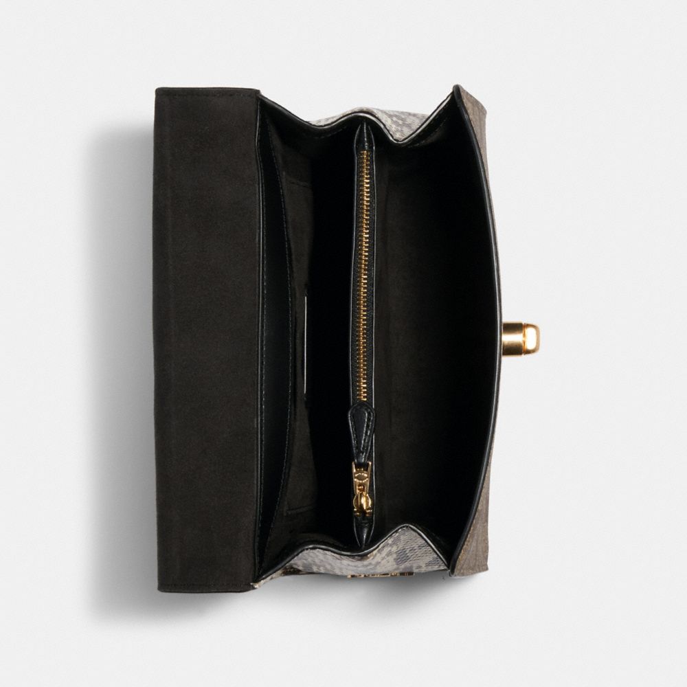 Signature coated canvas, smooth leather and snake-embossed leather| Inside zip and multifunction pockets| Turnlock closure, fabric lining| Top handle with 4 3/4" drop| Outside slip pocket| Detachable strap with 22" drop for shoulder or crossbody wear| 9 3/4" (L) x 7" (H) x 4 1/4" (W)
