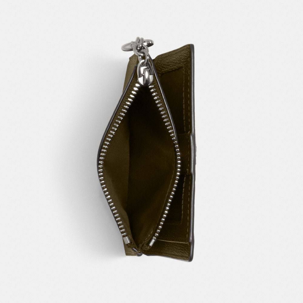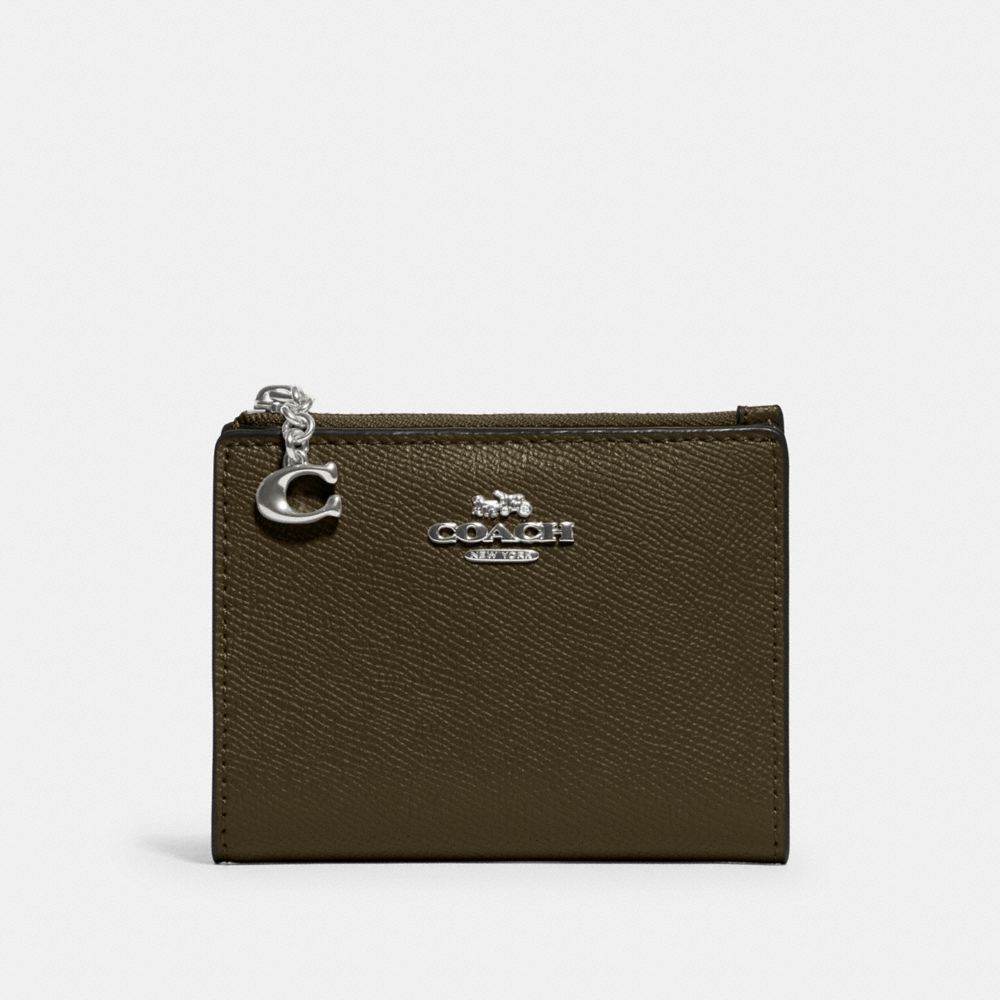 Crossgrain leather| Three credit card slots| Full-length bill compartment| ID window| Snap closure| Zip coin pocket| 4 1/2" (L) x 3 3/4" (H)