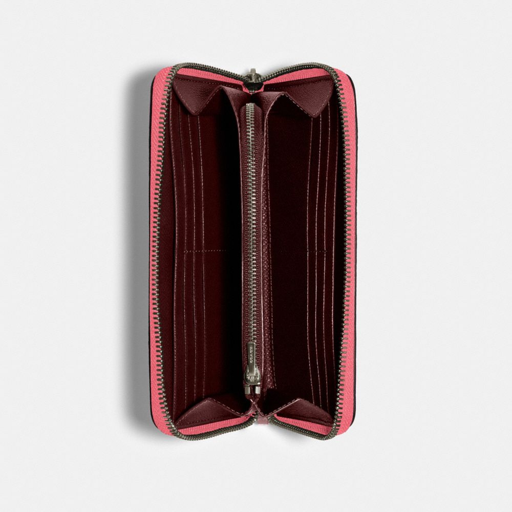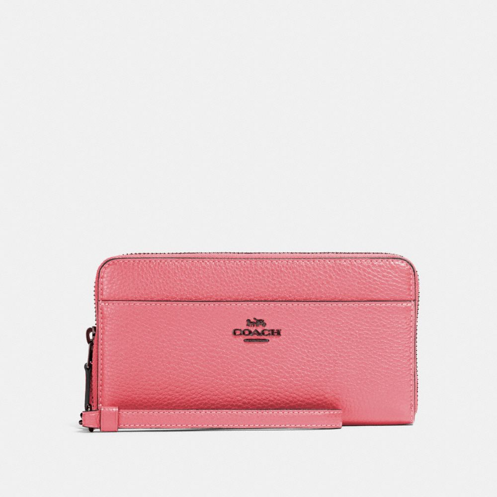 Polished pebble leather| 12 credit card slots| Full-length bill compartments| Zip coin pocket| Zip-around closure| Outside open pocket| Wrist strap attached| 7 1/2" (L) x 4" (H) x 3/4" (W)| Fits all phone sizes up to an iPhone X and Samsung S7 Edge