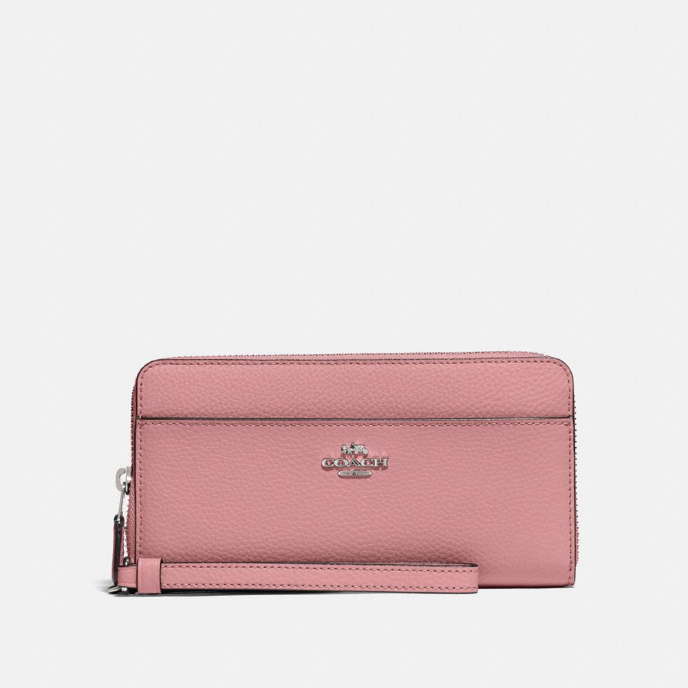 Polished pebble leather| 12 credit card slots| Full-length bill compartments| Zip coin pocket| Zip-around closure| Outside open pocket| Wrist strap attached| 7 1/2" (L) x 4" (H) x 3/4" (W)| Fits all phone sizes up to an iPhone X and Samsung S7 Edge