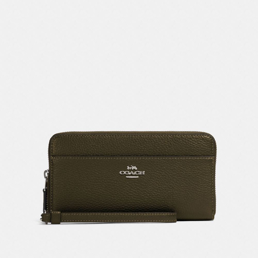 Polished pebble leather| 12 credit card slots| Full-length bill compartments| Zip coin pocket| Zip-around closure| Outside open pocket| Wrist strap attached| 7 1/2" (L) x 4" (H) x 3/4" (W)
