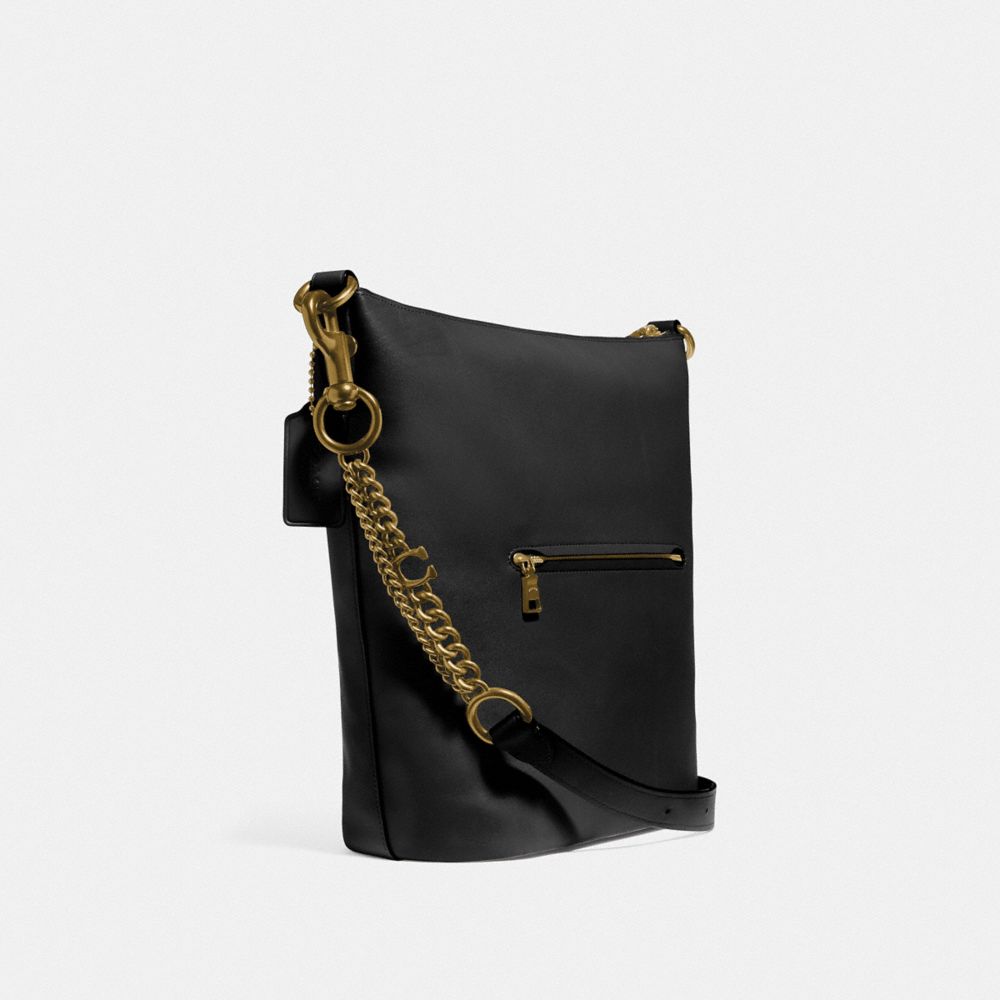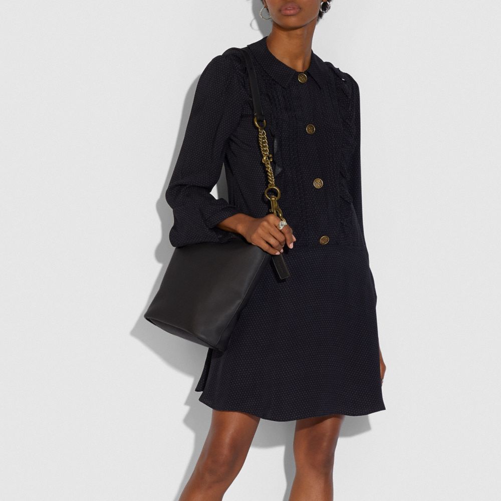 Glovetanned leather| Inside zip and snap pockets| Zip-top closure, fabric lining| Outside zip pocket| Detachable strap with 13 1/2" drop for shoulder or crossbody wear| 10 1/2" (L) x 12 1/4" (H) x 4 3/4" (W)