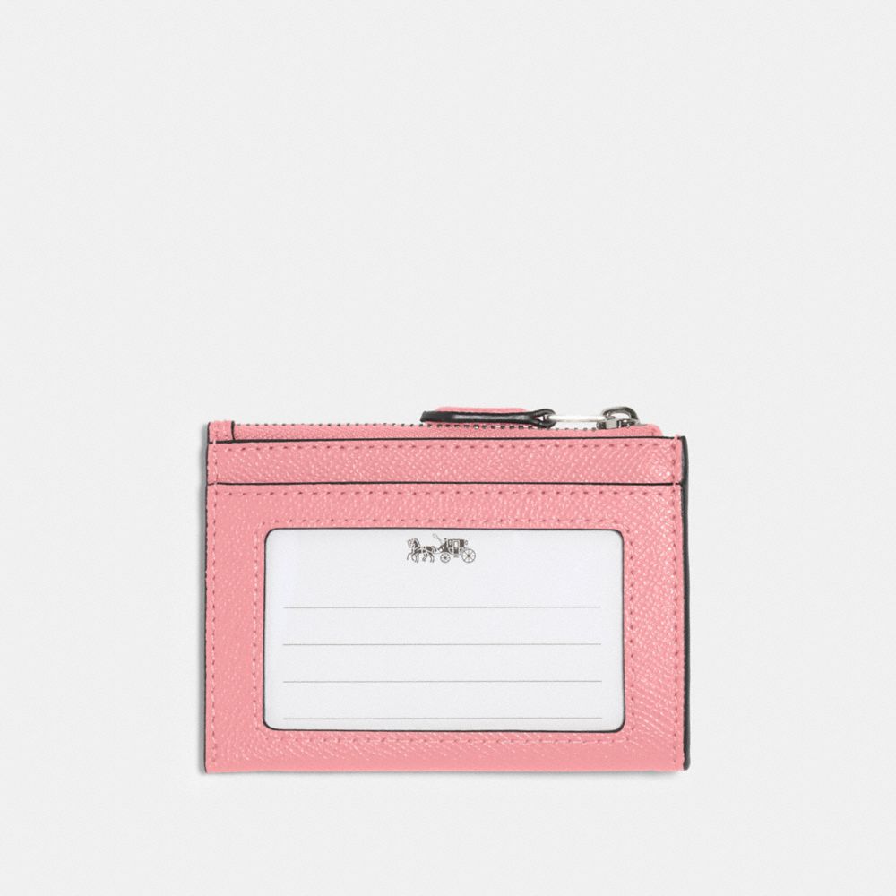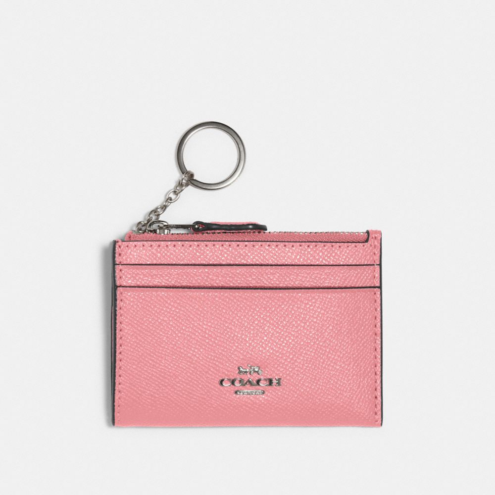 Crossgrain leather| Two credit card slots| ID window| Zip-top closure, fabric lining| Attached split key ring| 4 1/4" (L) x 3" (H) x 1/2" (W)