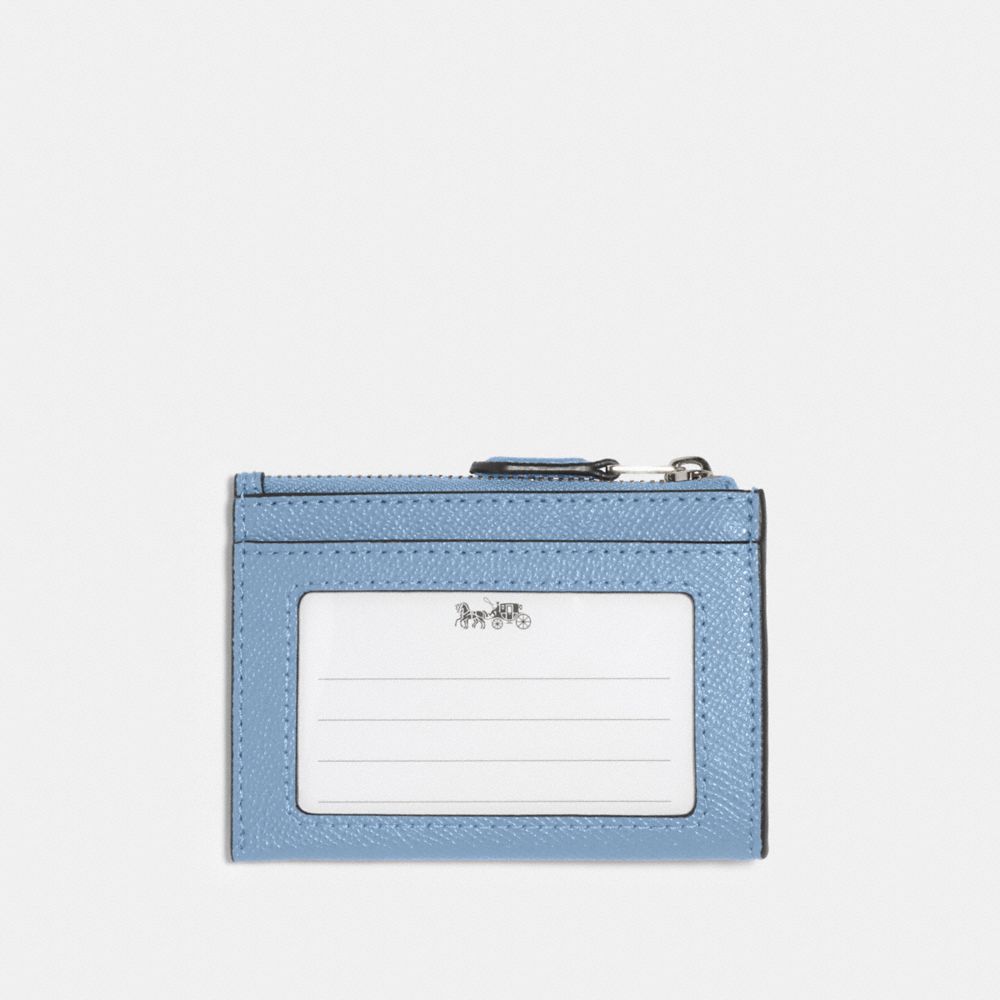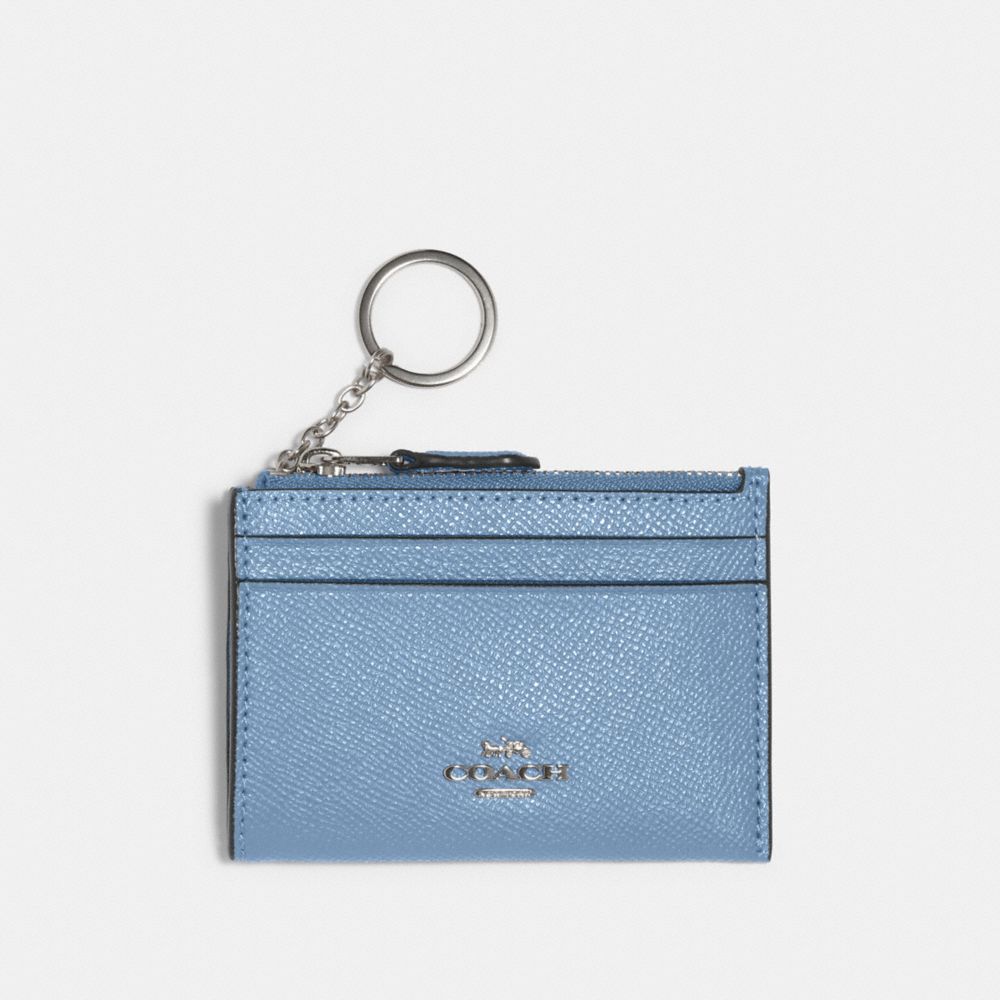 Crossgrain leather| Two credit card slots| ID window| Zip-top closure, fabric lining| Attached split key ring| 4 1/4" (L) x 3" (H) x 1/2" (W)