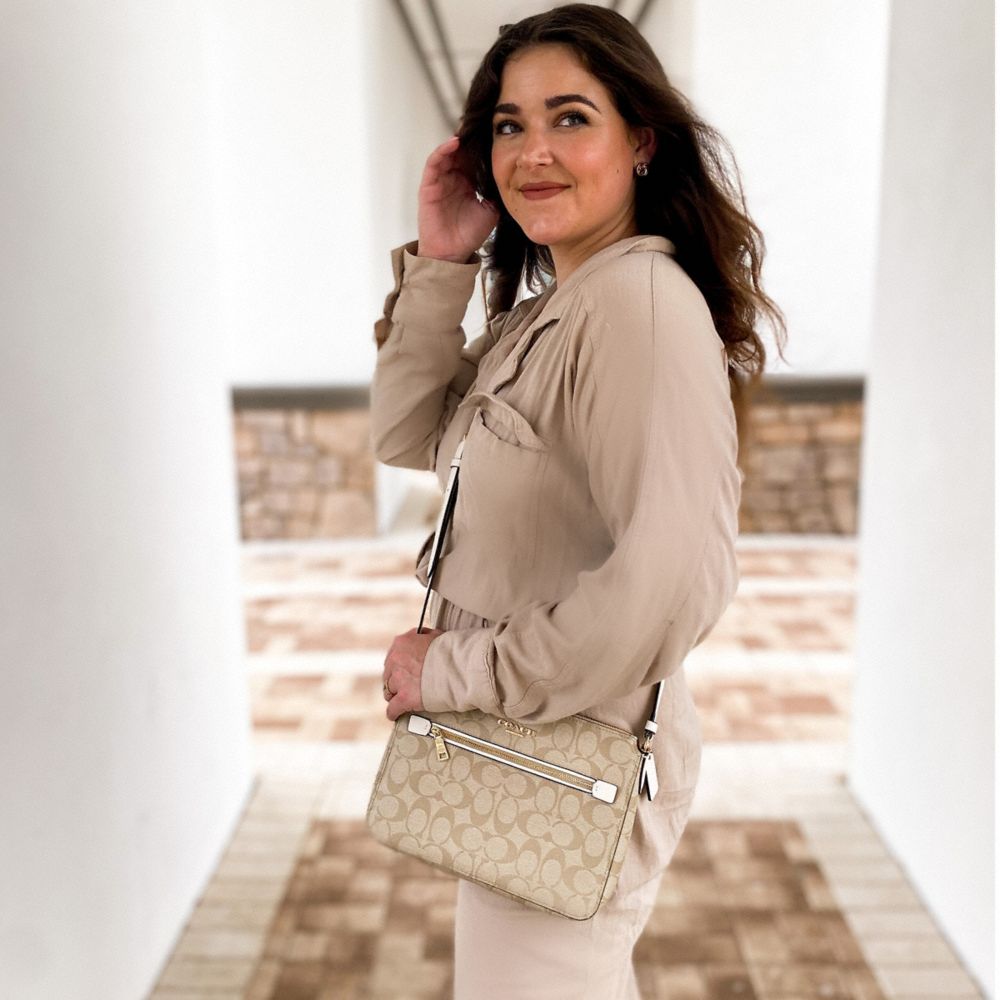 Signature coated canvas with smooth leather details| Inside multifunction pocket| Zip-top closure, fabric lining| Outside zip pocket| Detachable strap with 21 1/4" drop for shoulder or crossbody wear| 10" (L) x 7 1/4" (H) x 2" (W)