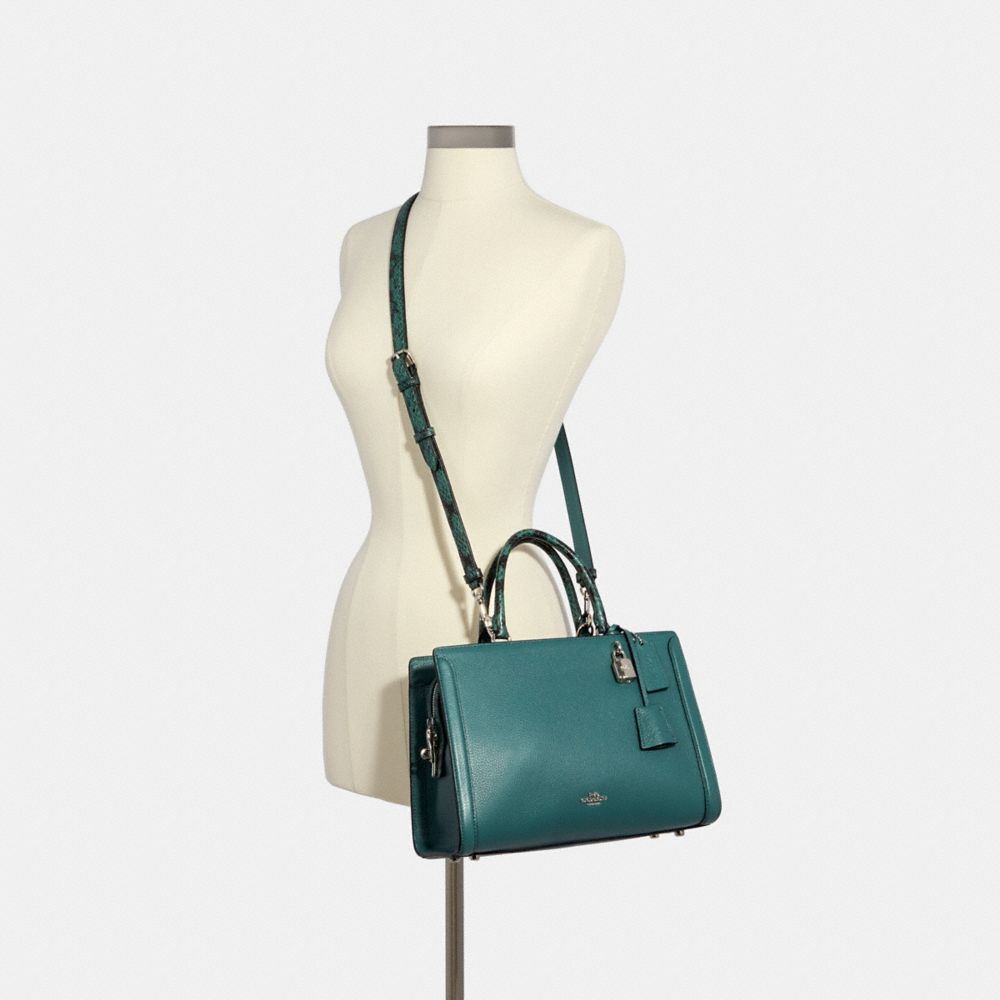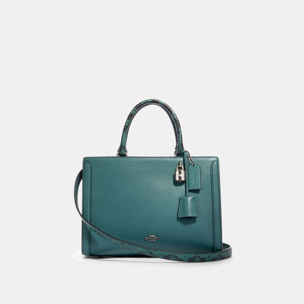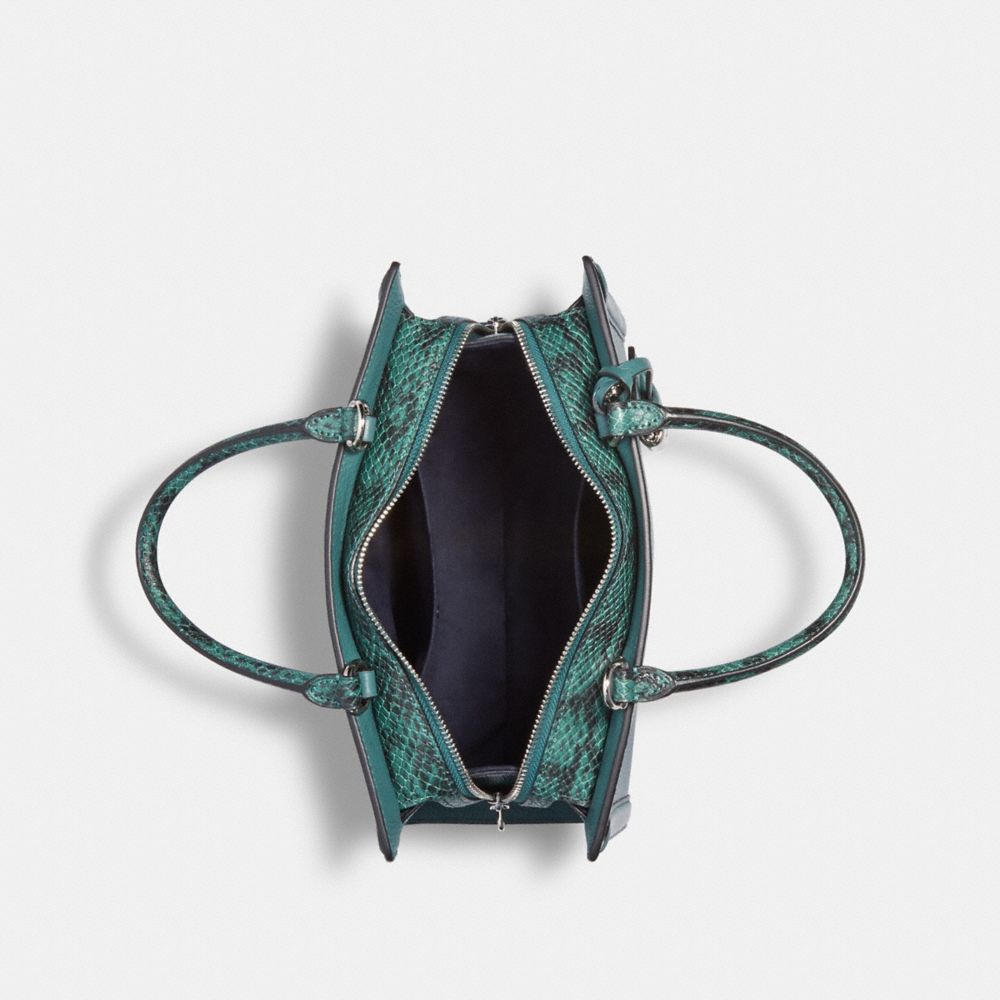 Refined pebble leather and snake-embossed leather| Inside multifunction pockets| Zip closure, fabric lining| Handles with 4 1/4" drop| Outside open pocket| Detachable strap with 21 1/4" drop for shoulder or crossbody wear| 11 1/2" (L) x 8" (H) x 5 1/4" (W)