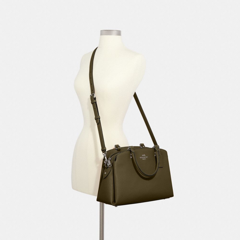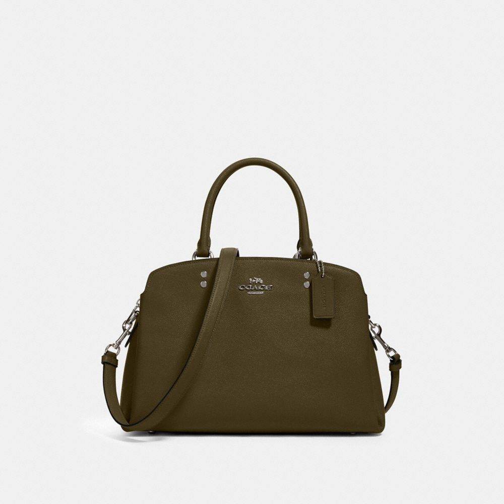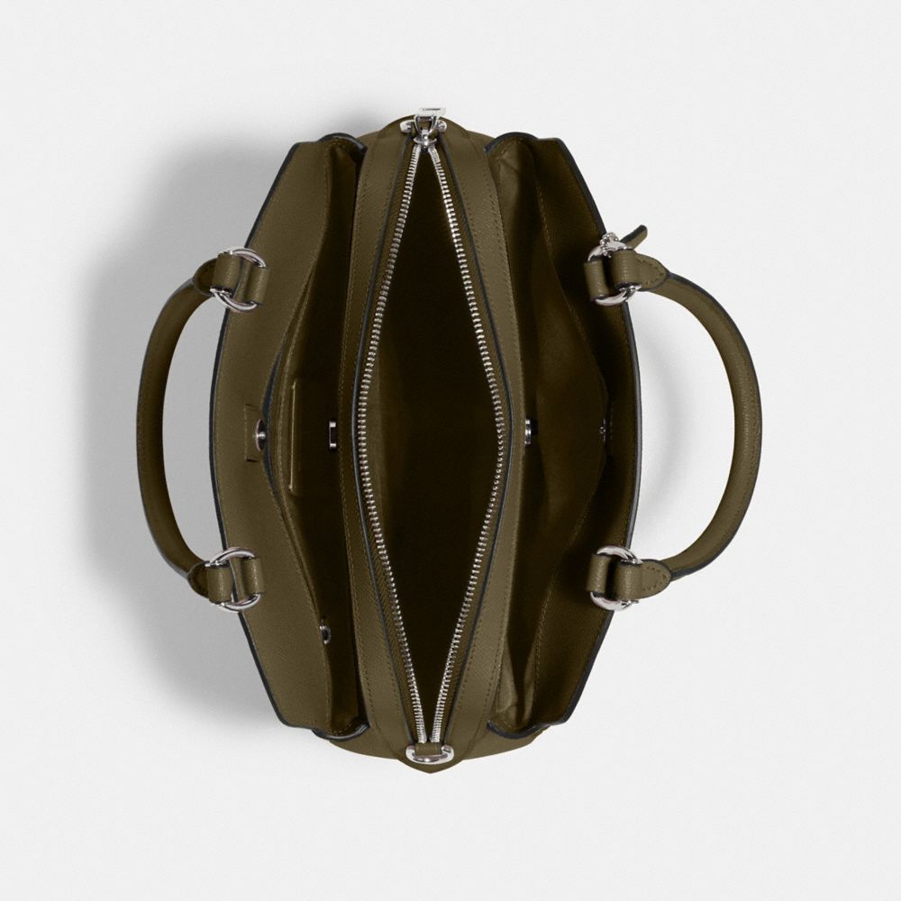 Crossgrain leather| Inside zip and multifunction pockets| Center zip compartment| Snap closure, fabric lining| Handles with 4 3/4" drop| Outside open pocket| Detachable strap with 20" drop for shoulder or crossbody wear| 12 3/4" (L) x 8 3/4" (H) x 5 1/4" (W)