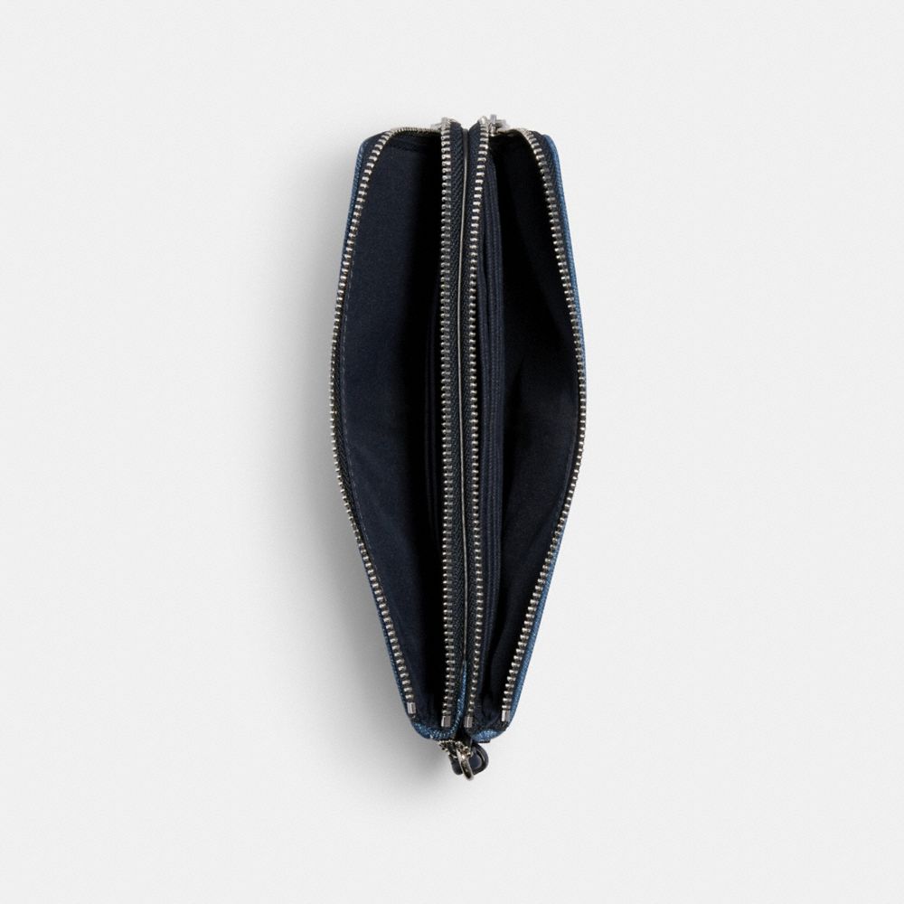 Denim with refined pebble leather details| Six credit card slots| Full-length bill compartment| Inside open pockets| Double zip closure, fabric lining| Wrist strap attached| 8 1/2" (L) x 4 1/2" (H) x 1 1/4" (W)| Fits all phone sizes up to an iPhone X and Samsung S7 Edge
