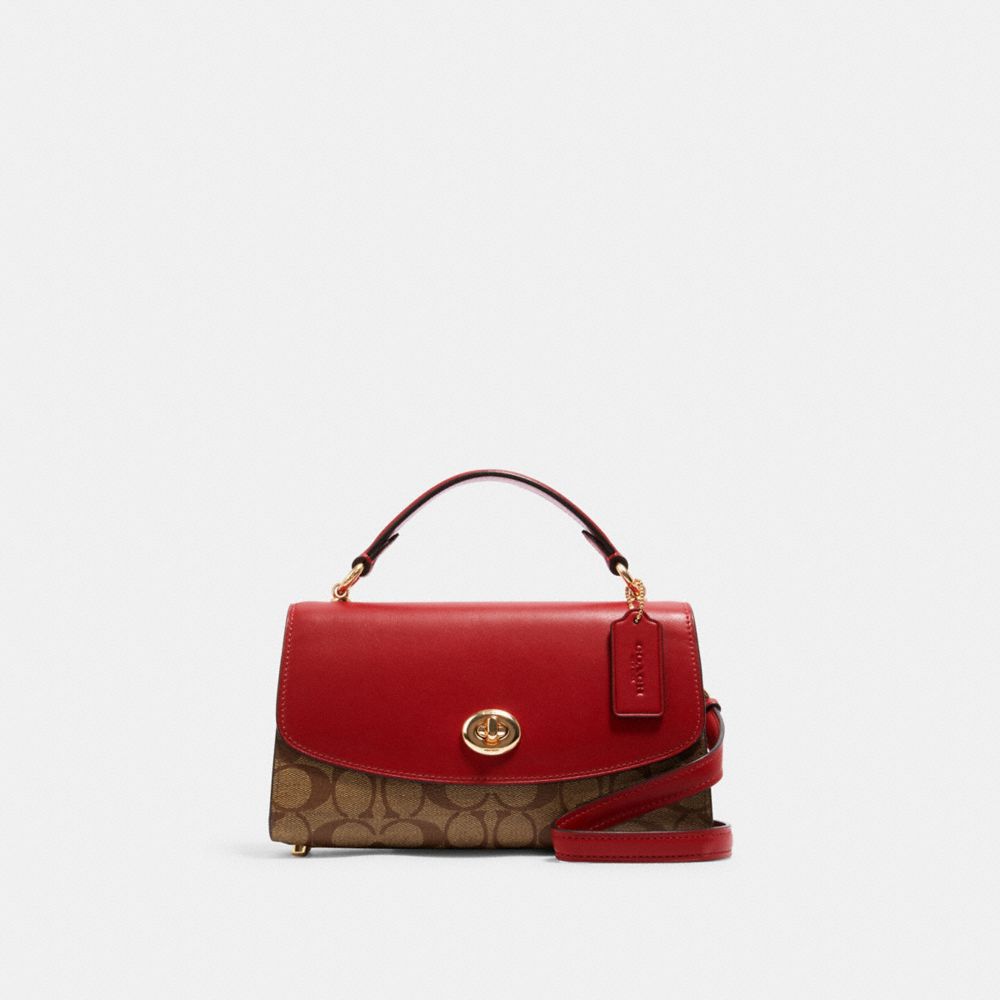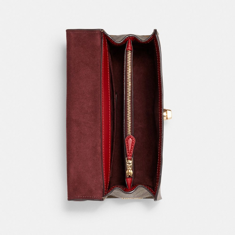 Signature coated canvas and smooth leather| Inside multifunction pocket| Center zip compartment| Turnlock closure, fabric lining| Handle with 2 1/2" drop| Outside open pocket| Detachable strap with 22 3/4" drop for shoulder or crossbody wear| Four protective feet at base| 9" (L) x 5" (H) x 3 1/4" (W)