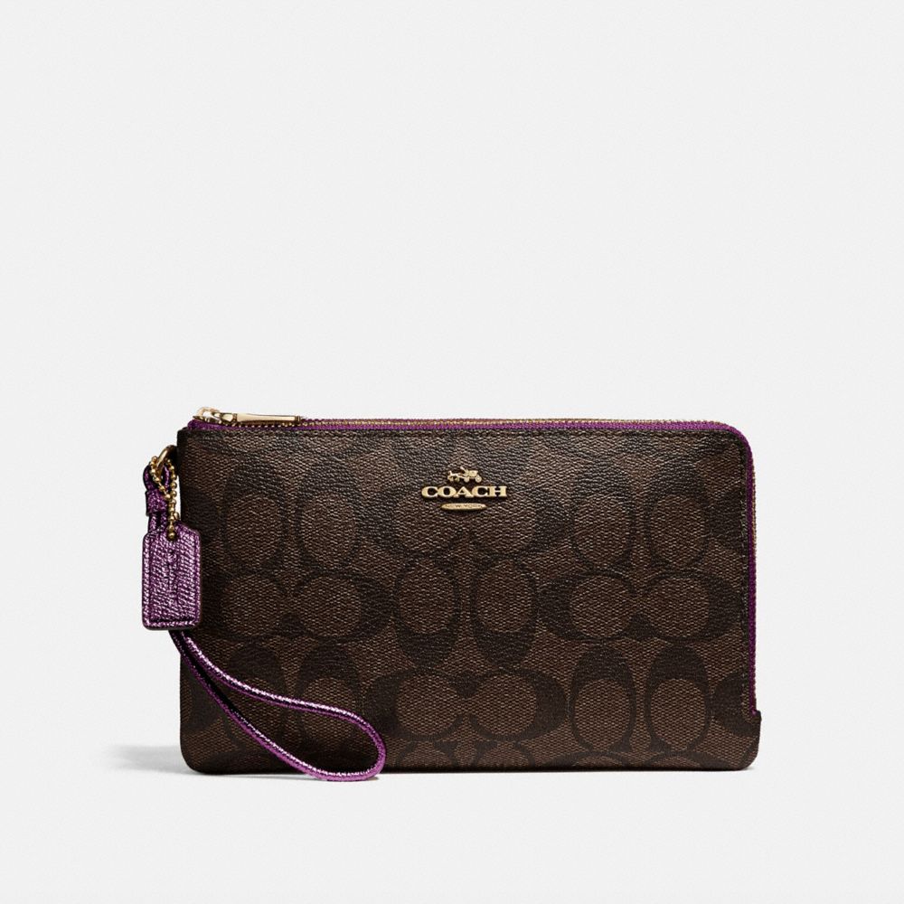 Signature coated canvas| Six credit card slots| Full-length bill compartment| Inside open pockets| Double zip closure, fabric lining| Wrist strap attached| 8 1/2" (L) x 4 1/2" (H) x 1 1/4" (W)| Fits all phone sizes up to an iPhone X and Samsung S7 Edge