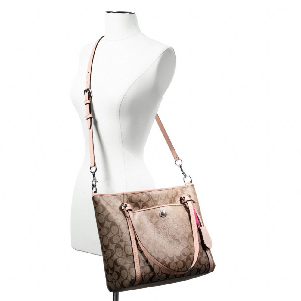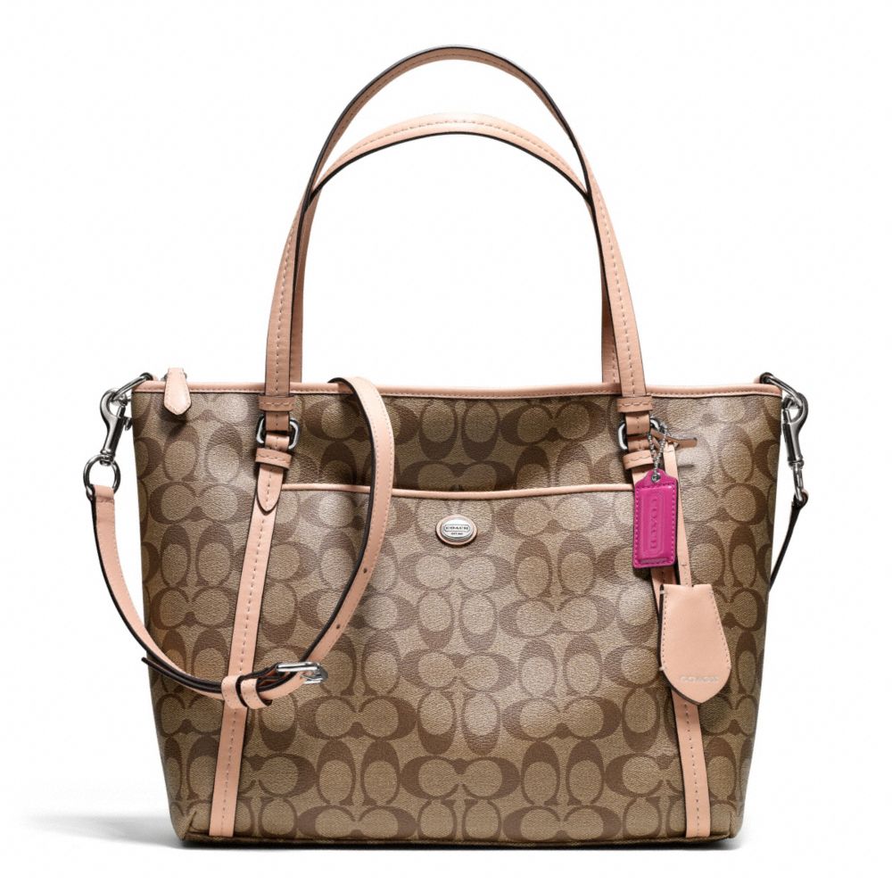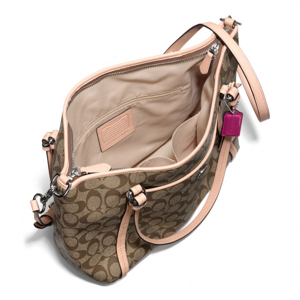 Details| | | Signature coated canvas with leather trim| Inside zip, cell phone and multifunction pockets| Zip-top closure, fabric lining| Outside open pockets| Handles with 8 1/4" drop| Longer strap for shoulder or crossbody wear| 12 1/2" (L) x 11" (H) x 5" (W)| This is a signature product
