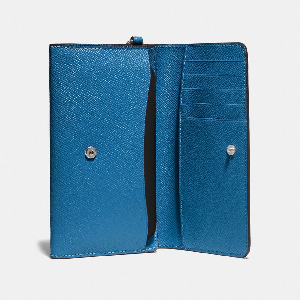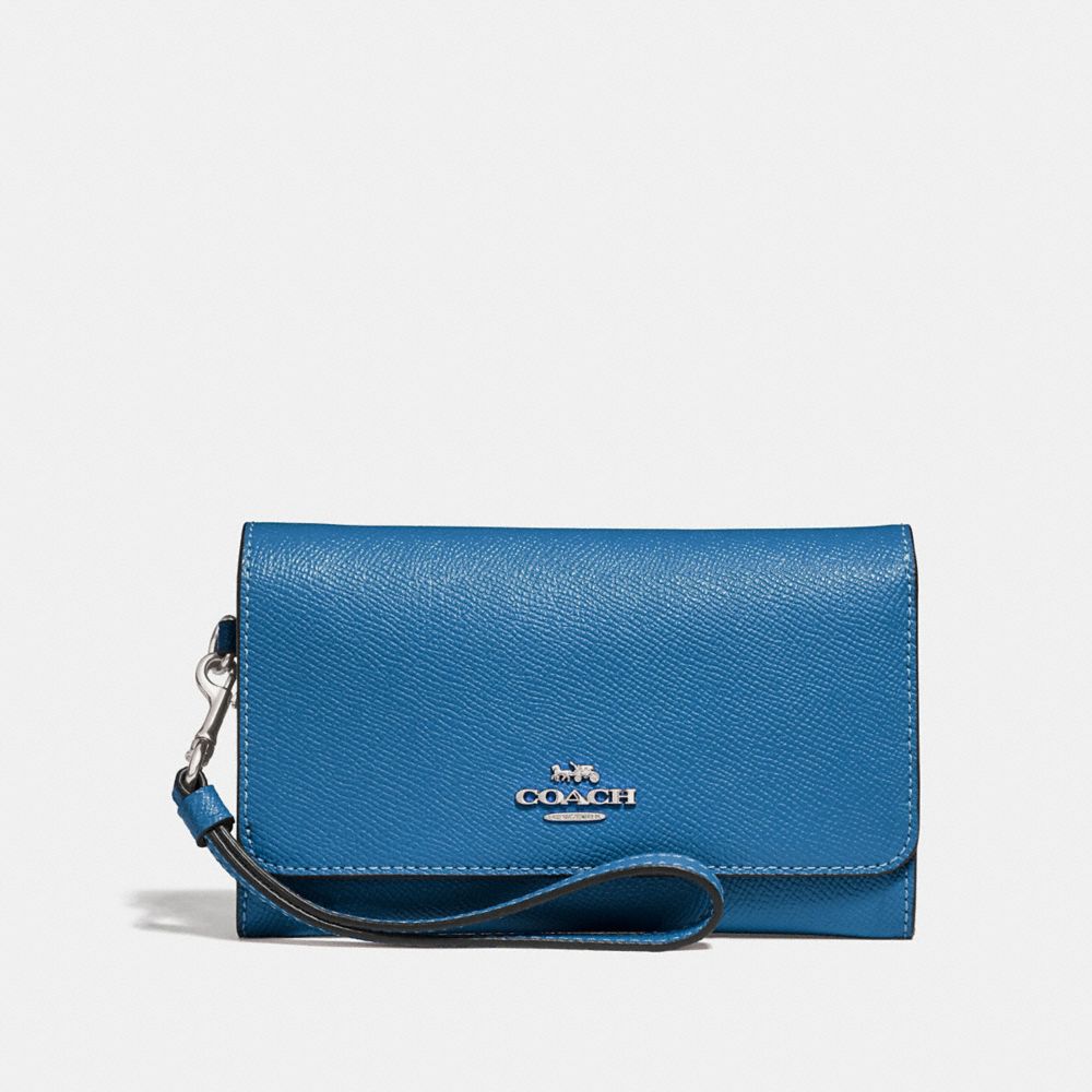 | Crossgrain leather| Eight credit card slots| Inside open pockets| Snap closure| Outside zip pocket| Detachable wrist strap| 6 1/2" (L) x 4" (H) x 3/4" (W)