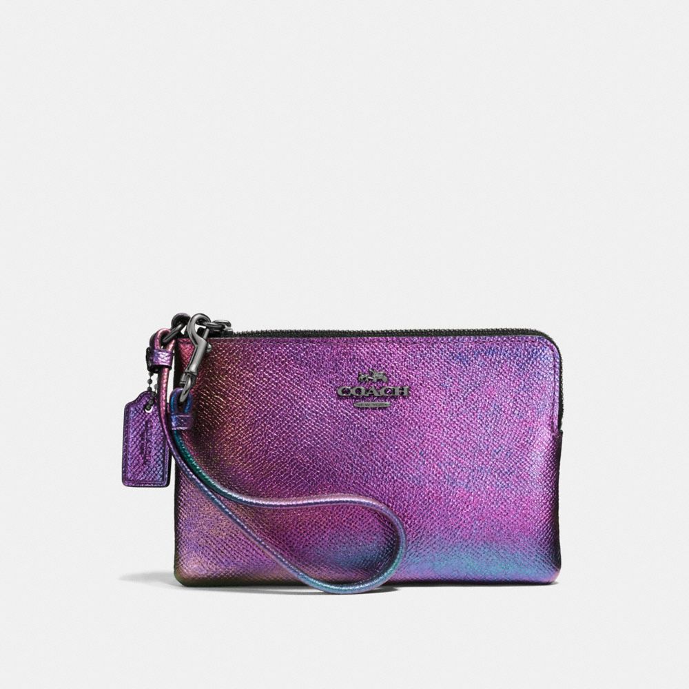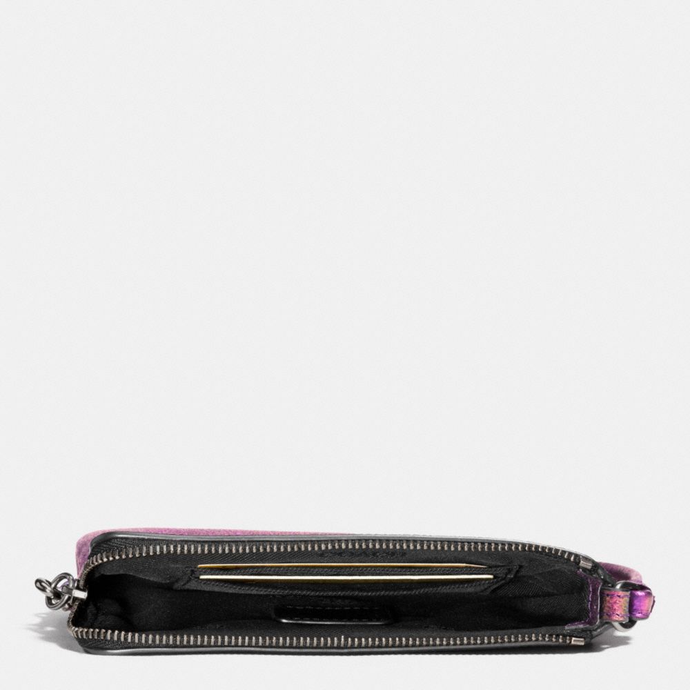 Hologram crossgrain leather| Two credit card slots| Zip-top closure, fabric lining| Strap with clip to form a wrist strap or attach to the inside of a bag| 6 1/4" (L) x 4" (H)| Fits an iPhone or Android