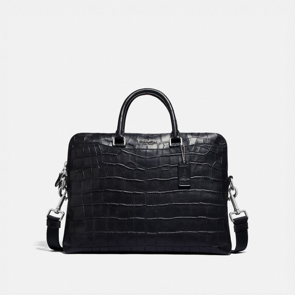 Crocodile-embossed leather| Inside zip, cell phone and multifunction pockets| Zip closure, fabric lining| Handles with 5" drop| Outside magnetic snap pockets| Detachable strap with 53" drop for shoulder or crossbody wear| 16 1/4" (L) x 16 1/2" (H) x 3 1/4" (W)