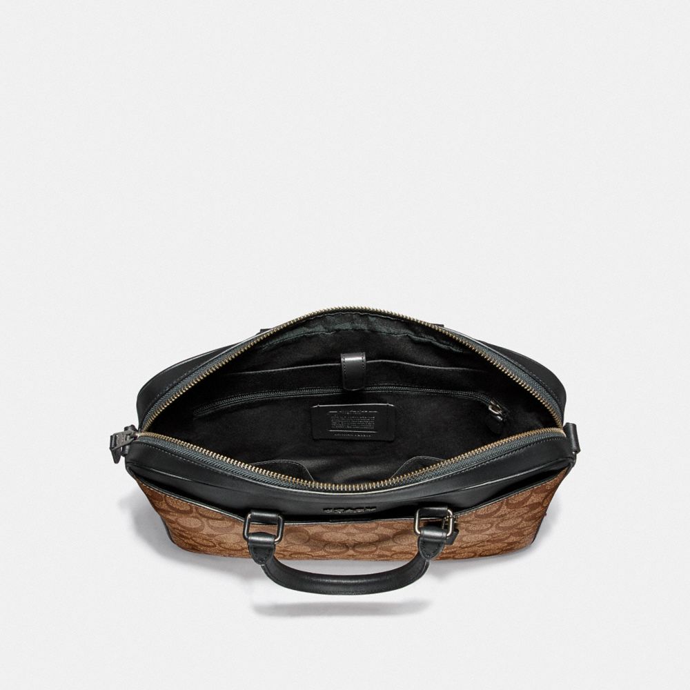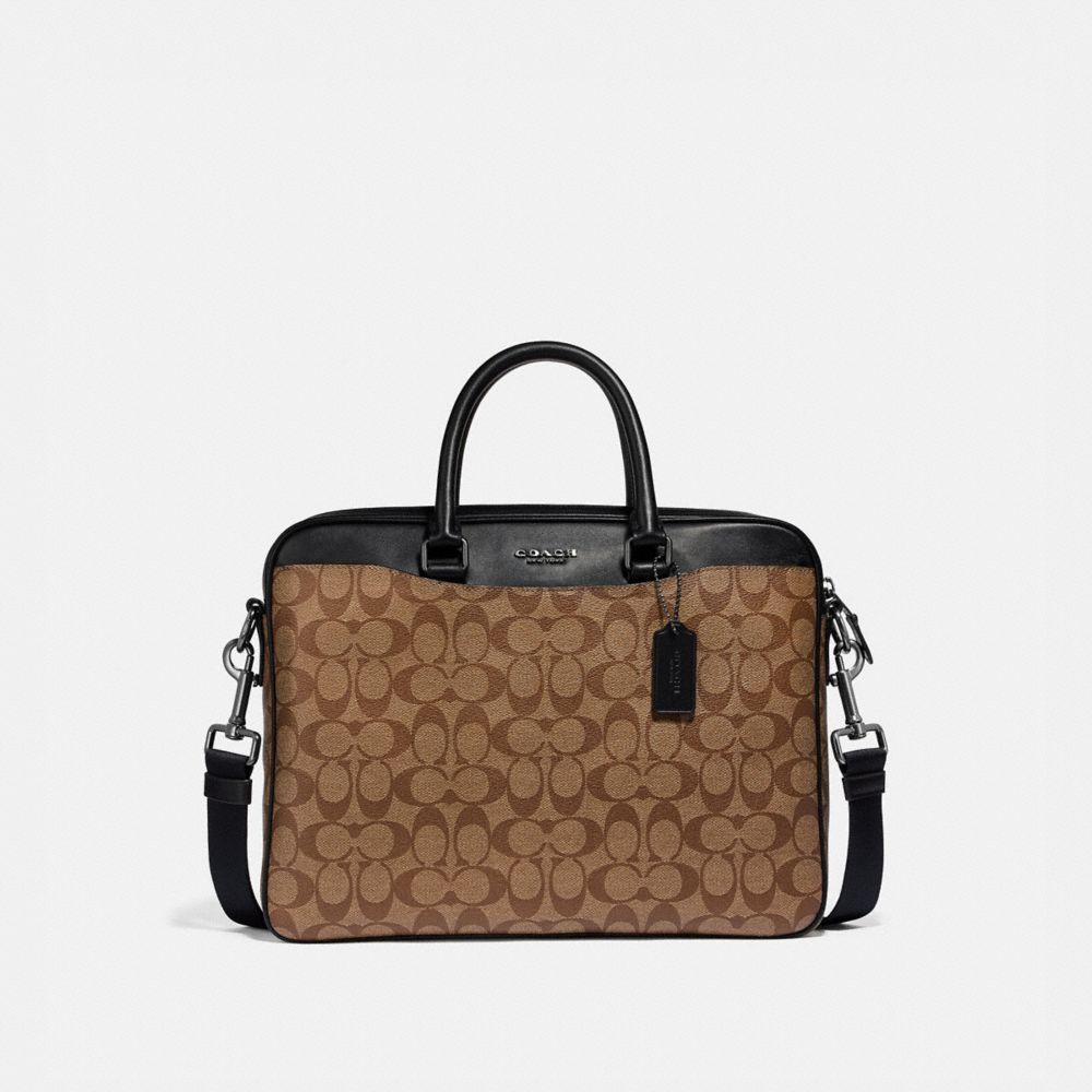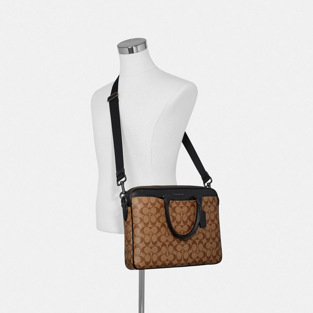 Signature coated canvas and refined calf leather| Inside zip, cell phone and multifunction pockets| Inside laptop sleeve with secure tab| Zip closure, fabric lining| Handles with 5" drop| Outside magnetic snap pockets| Detachable strap with 53" drop for shoulder or crossbody wear| 14" (L) x 11" (H) x 2" (W)