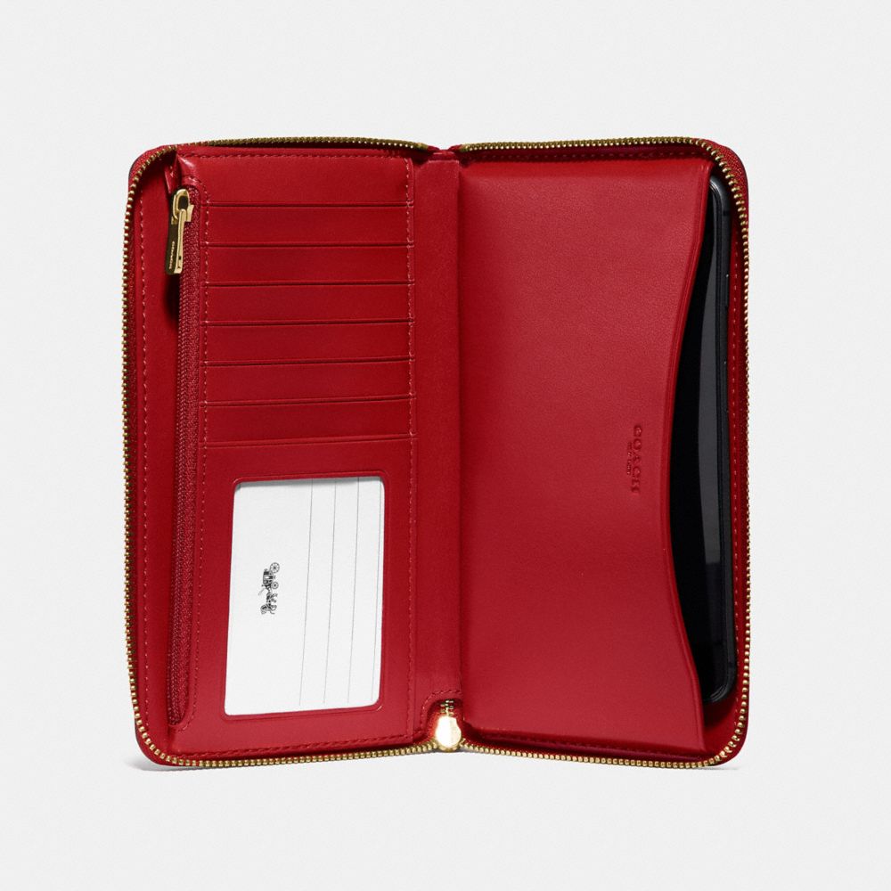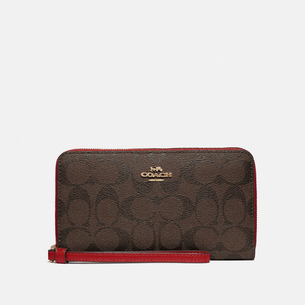 Signature coated canvas with smooth leather details| Six credit card slots| ID window| Zip coin pocket| Inside phone pocket| Zip-around closure| Wrist strap attached| 7 1/4" (L) x 4" (H) x 3/4" (W)