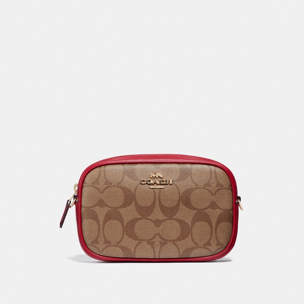 Signature coated canvas and smooth leather| Inside multifunction pockets| Zip closure, fabric lining| Outside open pocket| Adjustable strap for wear at waist| 6 3/4" (L) x 4 1/4" (H) x 1 1/2" (W)
