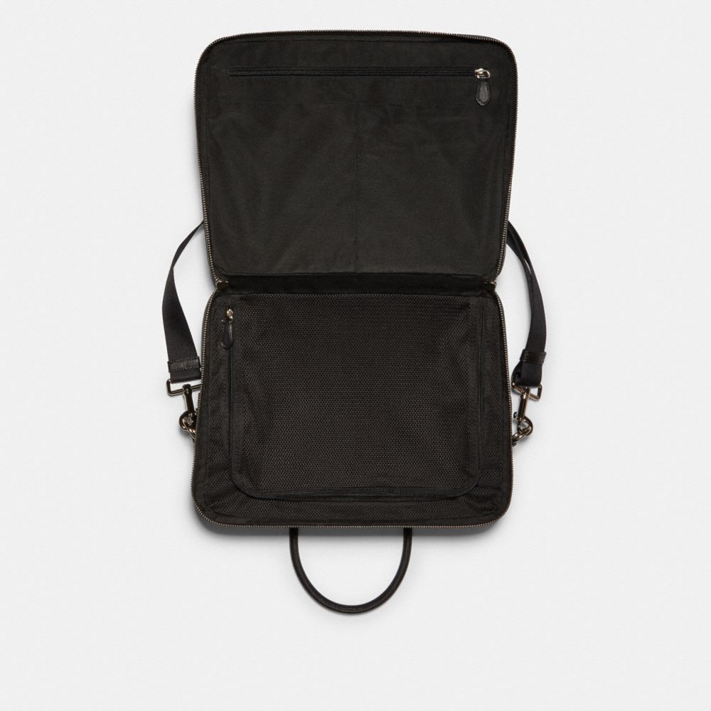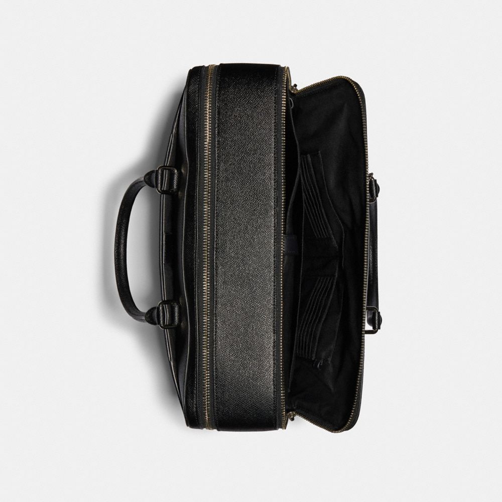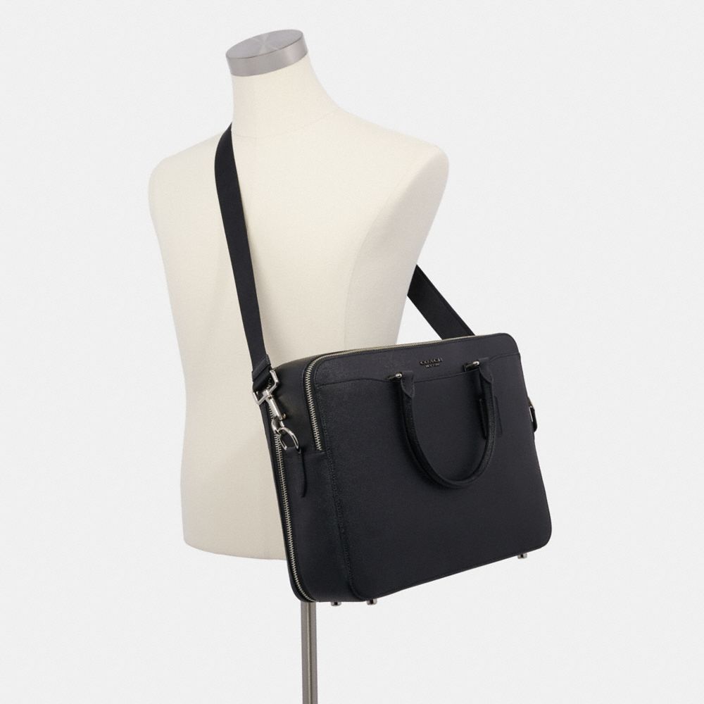 Crossgrain leather| Twelve credit card slots| Inside zip and multifunction pockets| Inside laptop sleeve with secure tab| Two interior compartments| Zip closure, fabric lining| Handles with 4 3/4" drop| Outside slip pockets| Detachable strap with 25" drop for shoulder or crossbody wear| 15" (L) x 11 1/2" (H) x 4 1/4" (W)