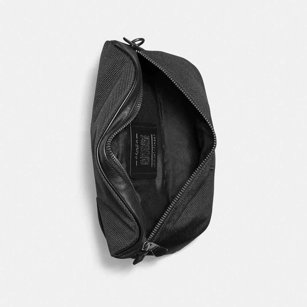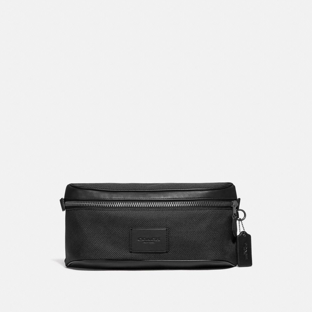 Nylon and smooth calf leather| Zip closure, fabric lining| Outside zip pocket| Adjustable strap for wear at waist| 11 1/2" (L) x 5 1/2" (H) x 2 3/4" (W)