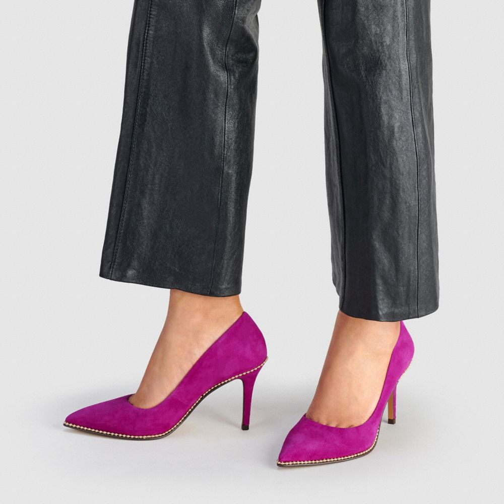 Suede upper| Man-made leather lining, leather footbed| Rubber outsole| Slip on| 3 1/2" heel