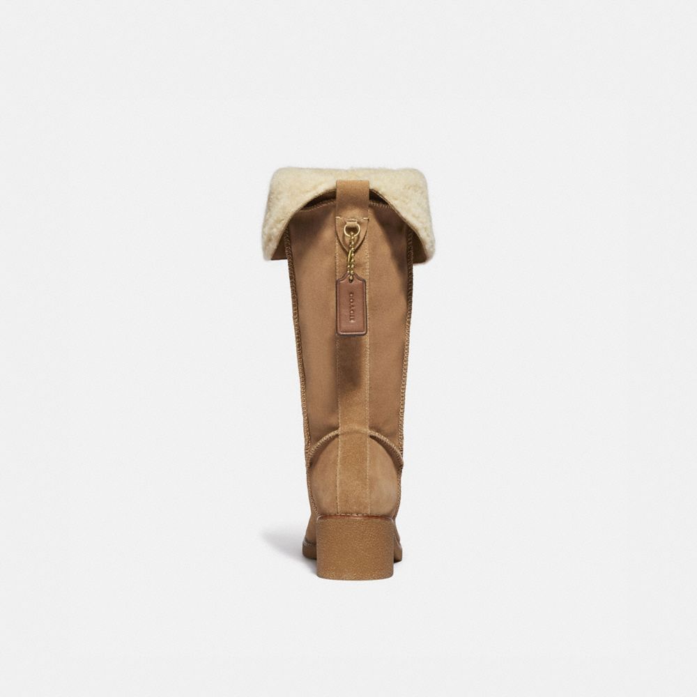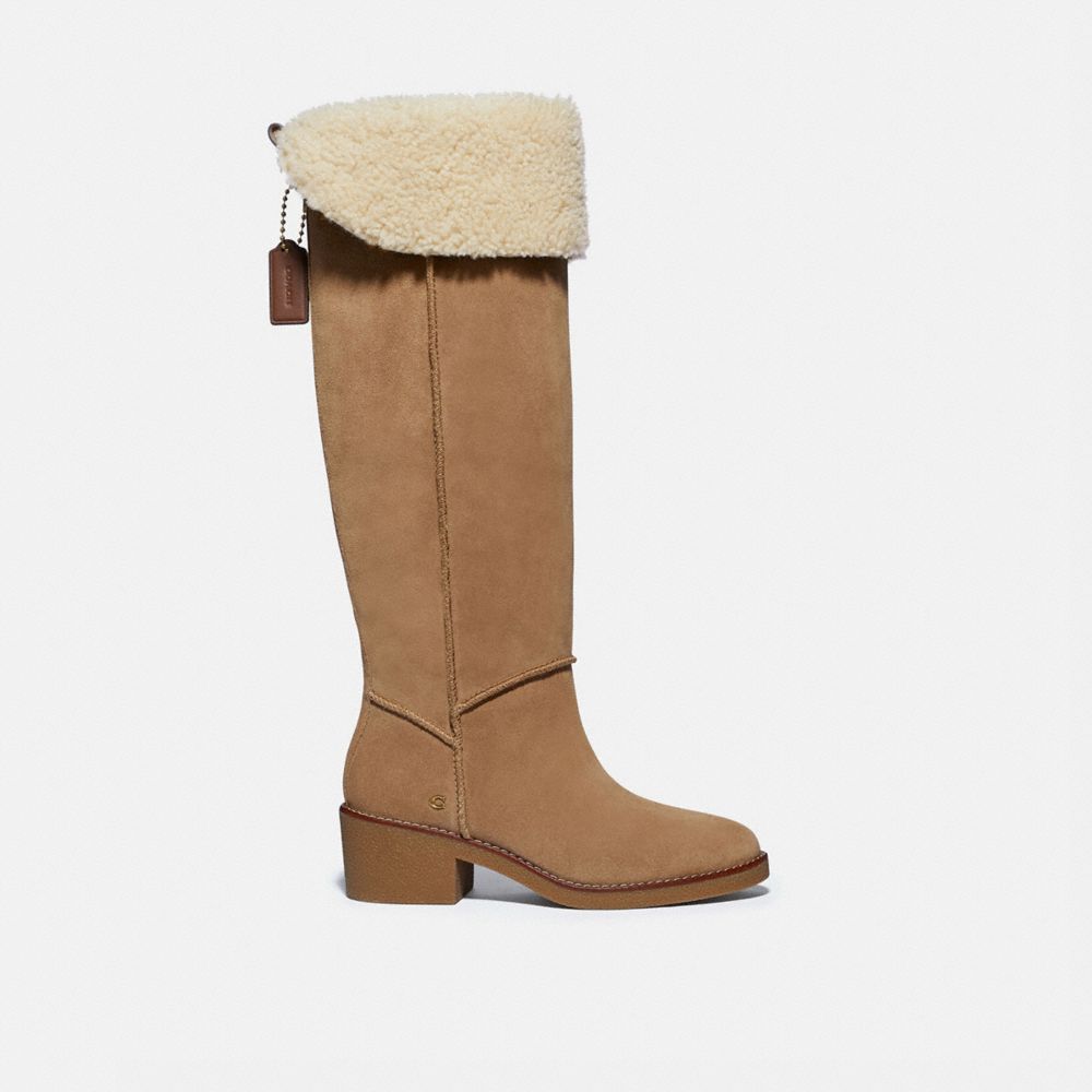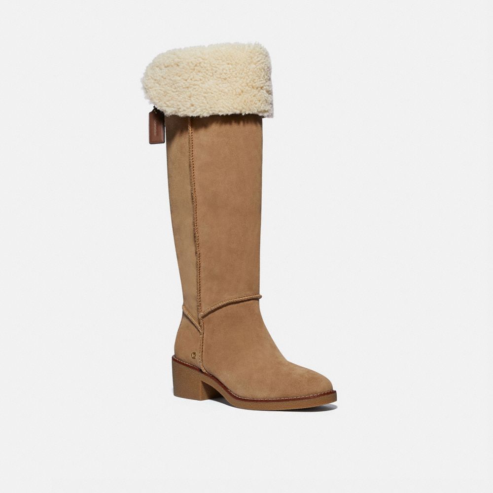 Suede upper| Leather and shearling lining,leather footbed| Rubber outsole| Pull on| Shaft: 19 3/4" height, 15 1/4" circumference| 2" heel