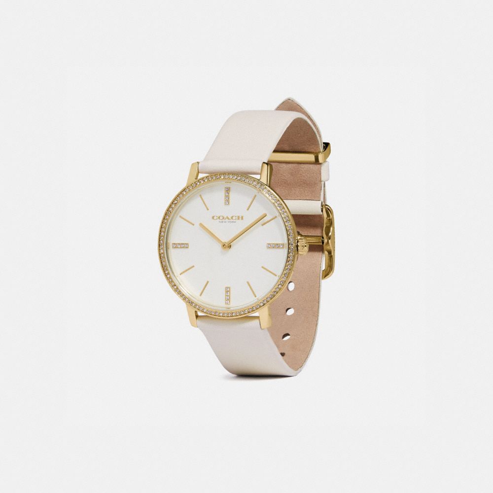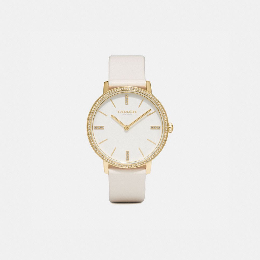 Gold tone case and leather strap| Approx. case diameter: 35mm| Crystals from Swarovski®| Mineral crystal| Quartz movement | Buckle closure | Water-resistant to 99 feet