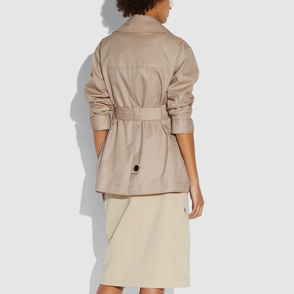 68% cotton, 32% polyester| Lining: 100% polyester| Zip and snap button closures| Flap pockets| Adjustable belt at waist| Water-resistant| Length: 31 1/2"| Dry clean| Model is 5'10" (178cm), chest 31" (79cm), waist 24" (61cm), hips 35" (89cm) and wears a size 2