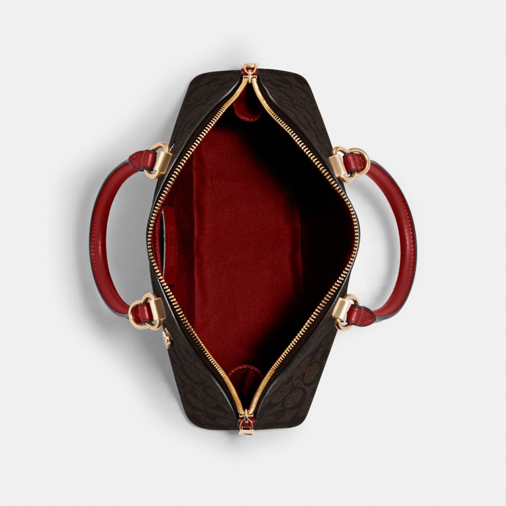 Signature coated canvas and smooth leather| Inside zip pocket| Zip closure, fabric lining| Handles with 3 3/4" drop| Outside zip pocket| Detachable strap with 22" drop for shoulder or crossbody wear| 11 3/4" (L) x 7 3/4" (H) x 4" (W)