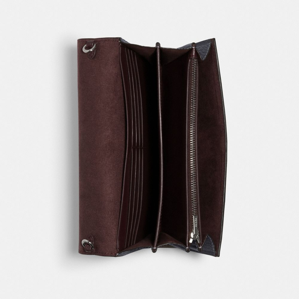 Refined pebble leather and smooth leather| Eight credit card slots| Inside zip and multifunction pockets| Snap closure, fabric lining| Outside slip pocket| Detachable chain strap with 23" drop for shoulder or crossbody wear| 8" (L) x 5 1/2" (H)