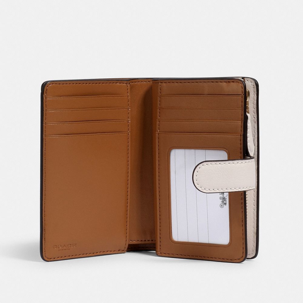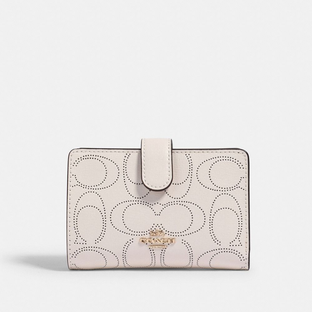 Signature perforated leather| Seven credit card slots| Bill compartment| ID window| Zip pocket| Snap closure| 5" (L) x 3 1/2" (H) x 1/2" (W)