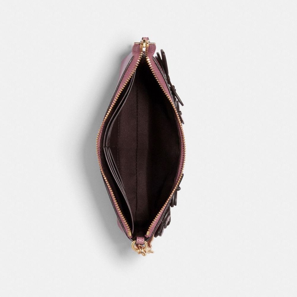 Crossgrain leather, smooth leather and snake-embossed leather| Eight credit card slots| Zip-top closure, fabric lining| Chain wrist strap with dogleash clip attached| Outside open pocket| 8" (L) x 4 3/4" (H) x 3/4" (W)