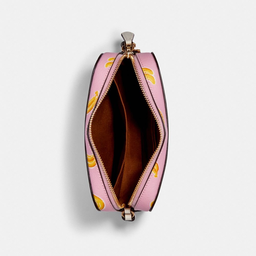 Printed coated canvas and smooth leather| Two credit card slots| Inside multifunction pocket| Zip closure, fabric lining| Outside open pocket| Adjustable strap with 23" drop for shoulder or crossbody wear| 7 1/4" (L) x 5 1/4" (H) x 2" (H)