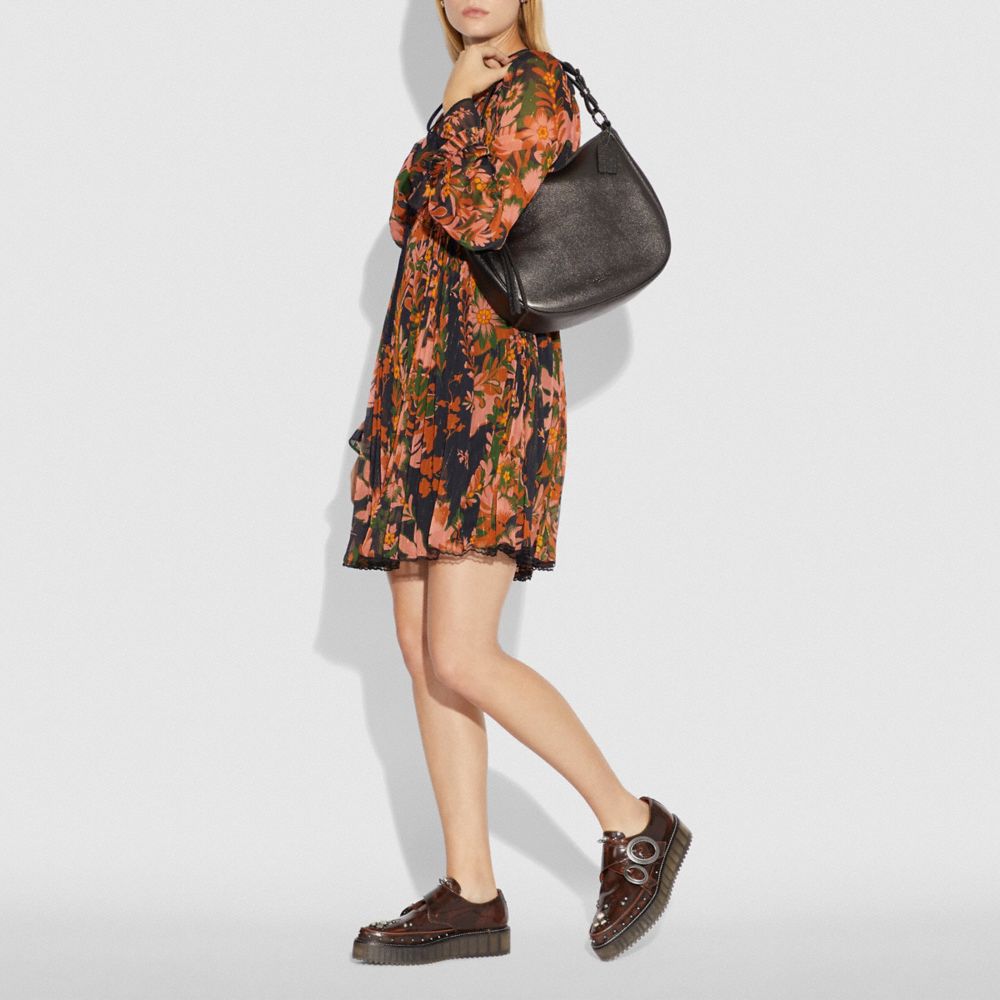 Metallic polished pebble leather| Inside zip, cell phone and multifunction pockets| Zip-top closure, fabric lining| Handle with 7 3/4" drop| Outside zip pocket| Detachable strap with 22" drop for shoulder or crossbody wear| Instantly change the look of your bag with an interchangeable strap.| 12 1/2" (L) x 10 1/2" (H) x 3 1/2" (W)