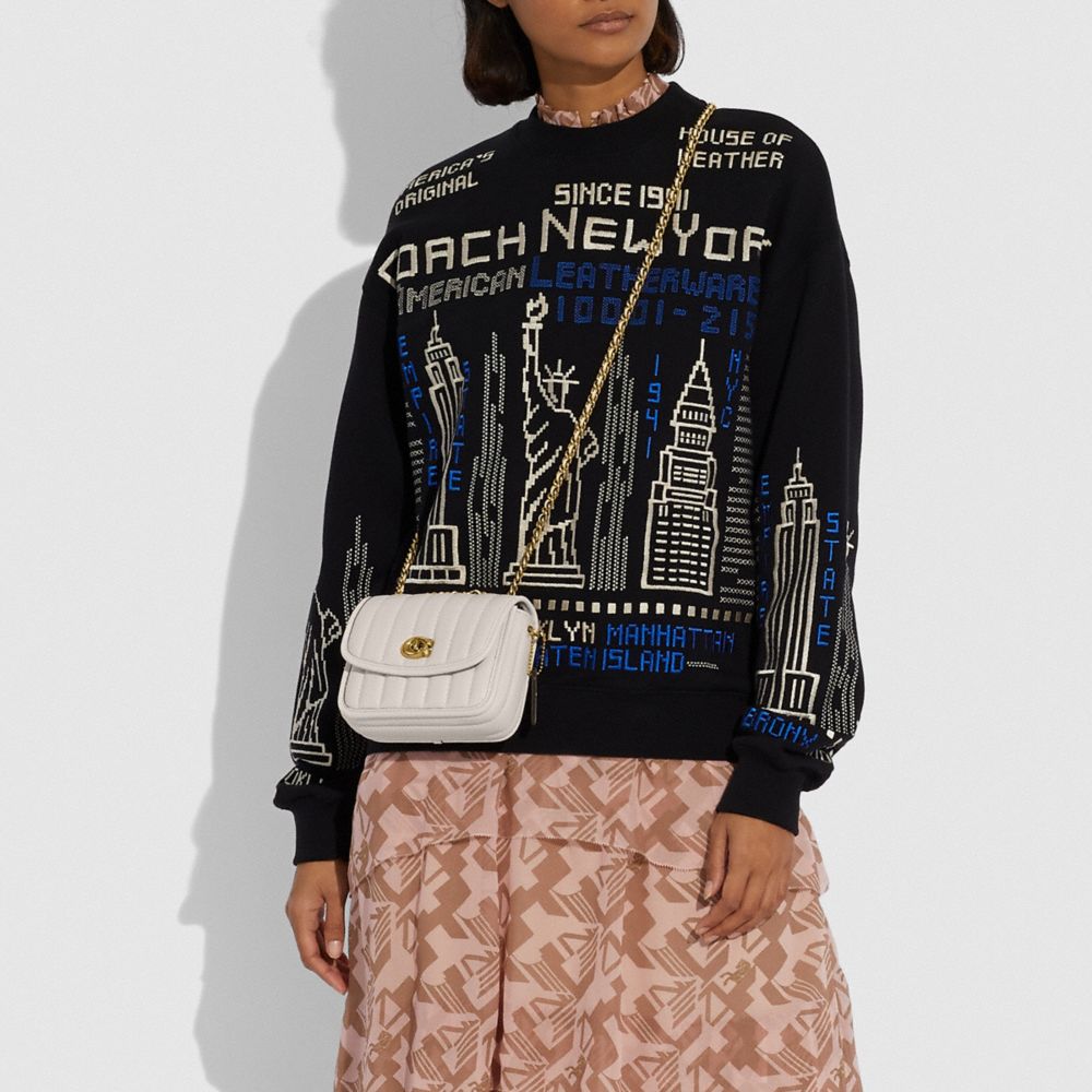 Nappa leather and smooth leather| Three credit card slots| Inside multifunction pocket| Turnlock closure, fabric lining| Outside open pocket| Handles convert to shoulder strap with 22" drop| 6 1/4" (L) x 5" (H) x 2" (W)
