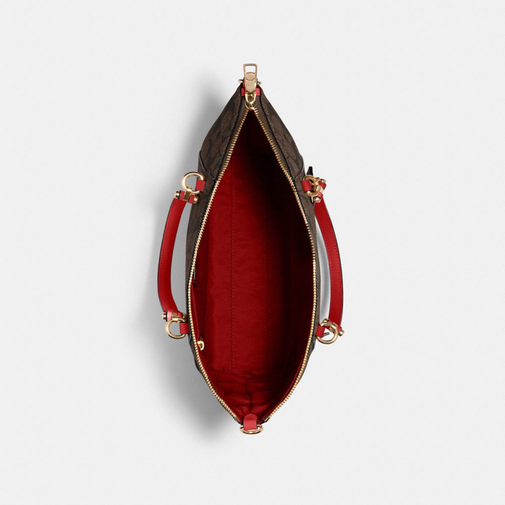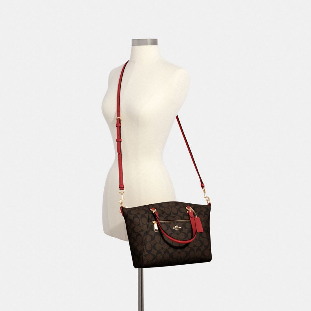 Signature coated canvas with smooth leather details| Inside zip pocket| Zip-top closure, fabric lining| Handles with 5" drop| Outside zip pocket| Detachable strap with 21" drop for shoulder or crossbody wear| 10 1/2" (L) x 8 3/4" (H) x 3 3/4" (W)