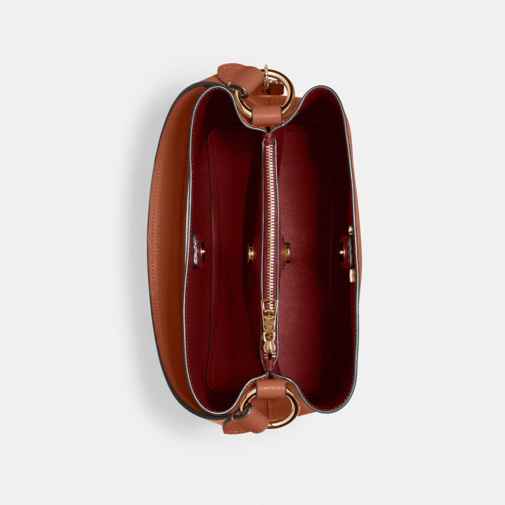 Polished pebble leather| Center zip compartment| Snap closure, fabric lining| Handle with 8" drop| Detachable strap with 20 1/2" drop for shoulder or crossbody wear| 10 1/4" (L) x 10" (H) x 5" (W)