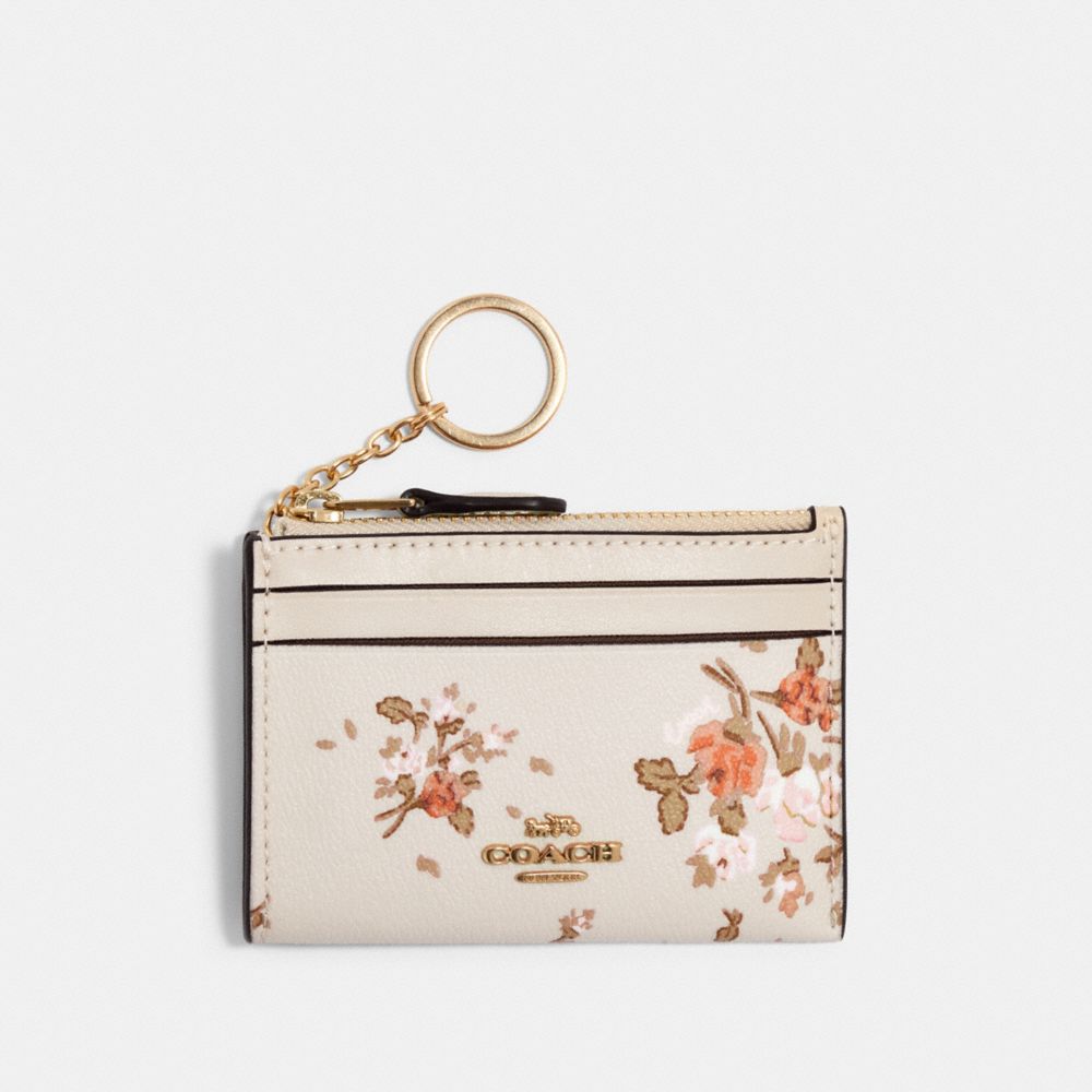 Printed coated canvas and smooth leather| Two credit card slots| ID window| Zip-top closure, fabric lining| Attached split key ring| 4 1/4" (L) x 3" (H) x 1/2" (W)