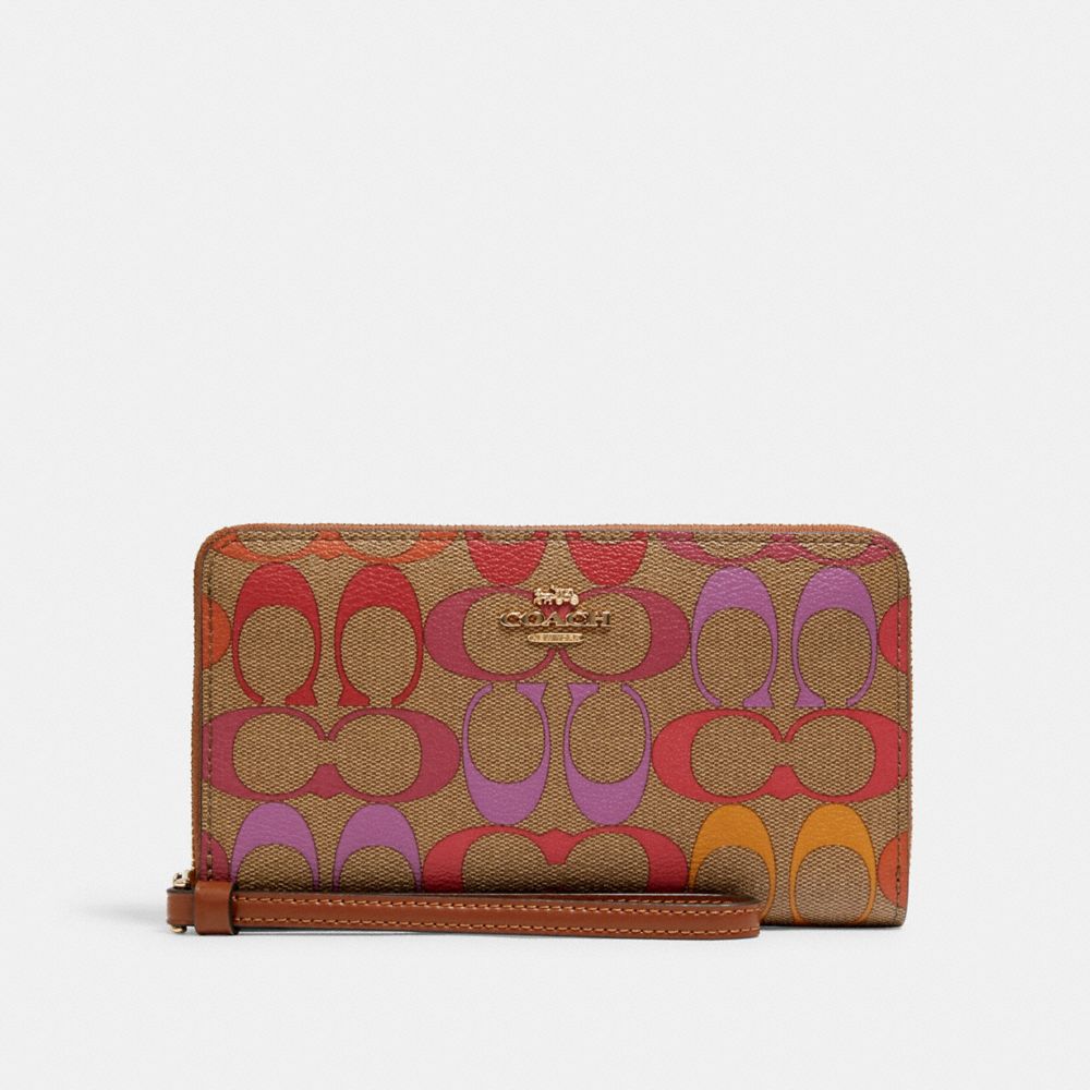 Signature coated canvas and smooth leather| Six credit card slots| ID window| Zip coin pocket| Inside phone pocket| Zip-around closure| Wrist strap attached| 7 1/4" (L) x 4" (H) x 3/4" (W)