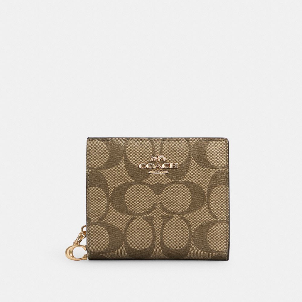 Signature coated canvas and smooth leather| Three credit card slots| ID window| Full-length bill compartment| Snap closure| Outside zip coin pocket| 4 1/4" (L) x 3 1/2" (H) x 1" (W)