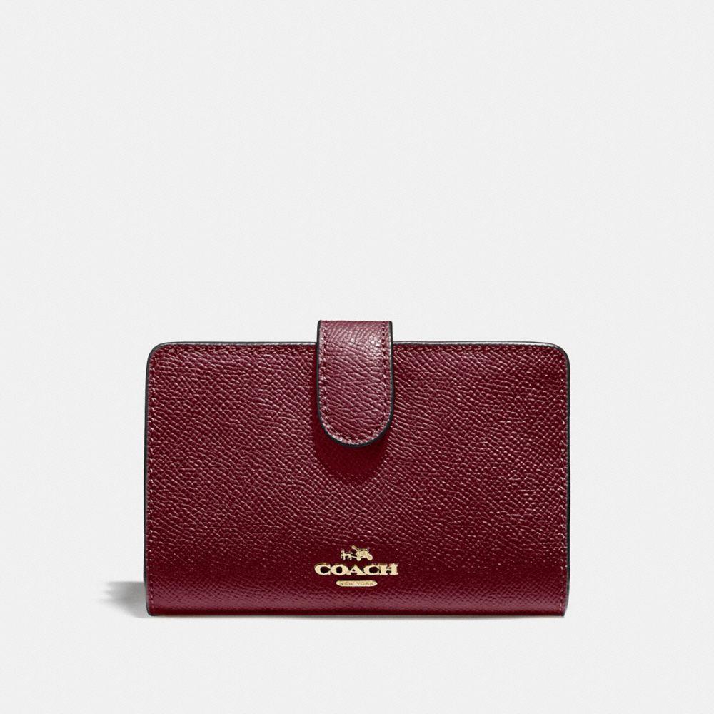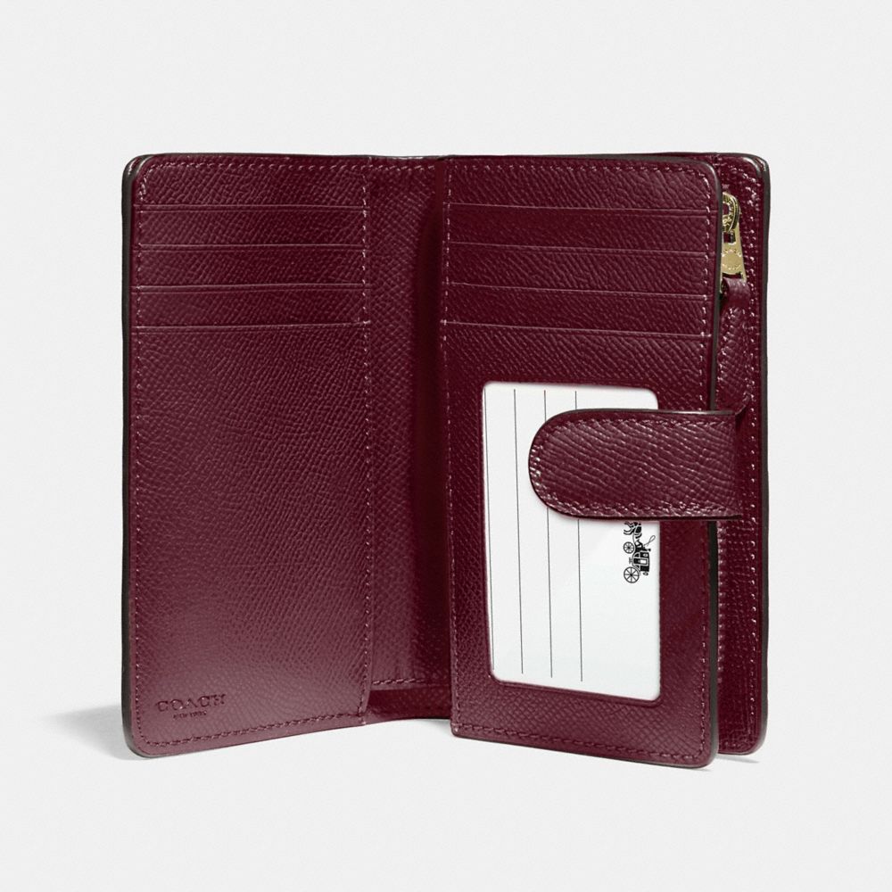| Crossgrain leather| Six credit card slots| Bill compartment| ID window| Zip pocket| Snap closure| 5" (L) x 3 1/2" (H) x 1/2" (W)