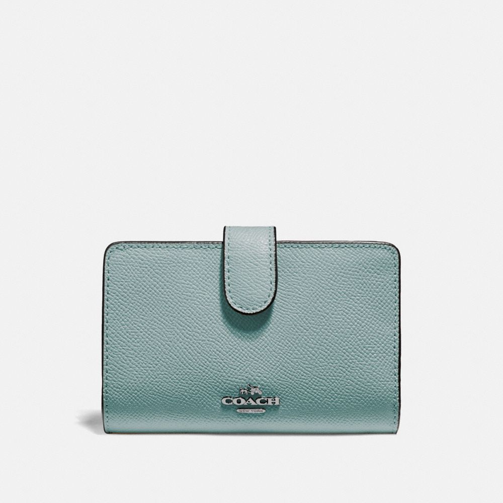 Crossgrain leather| Seven credit card slots| Bill compartment| ID window| Zip pocket| Snap closure| 5" (L) x 3 1/2" (H) x 1/2" (W)