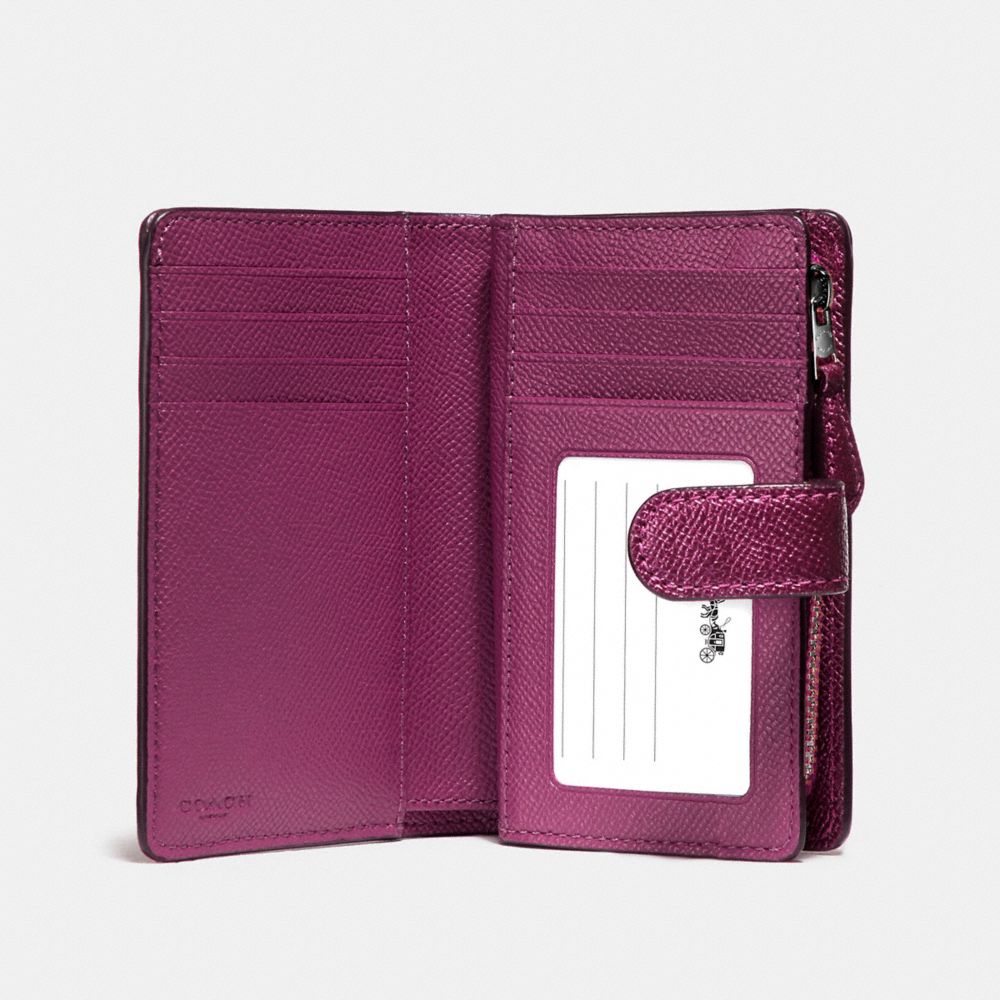| Metallic crossgrain leather| Seven credit card slots| Bill compartment| ID window| Zip pocket| Snap closure| 5" (L) x 3 1/2" (H) x 1/2" (W)