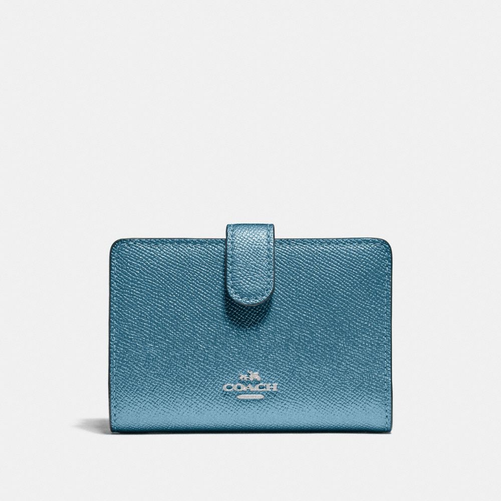 | Metallic crossgrain leather| Seven credit card slots| Bill compartment| ID window| Zip pocket| Snap closure| 5" (L) x 3 1/2" (H) x 1/2" (W)