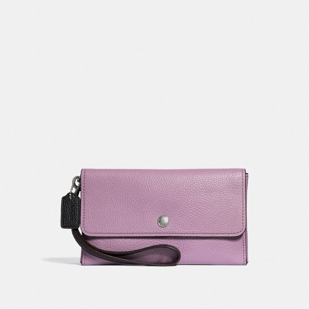 Polished pebble leather| Two credit card slots| Double zip and snap closures| Detachable wrist strap| 6 3/4" (L) x 4" (H)