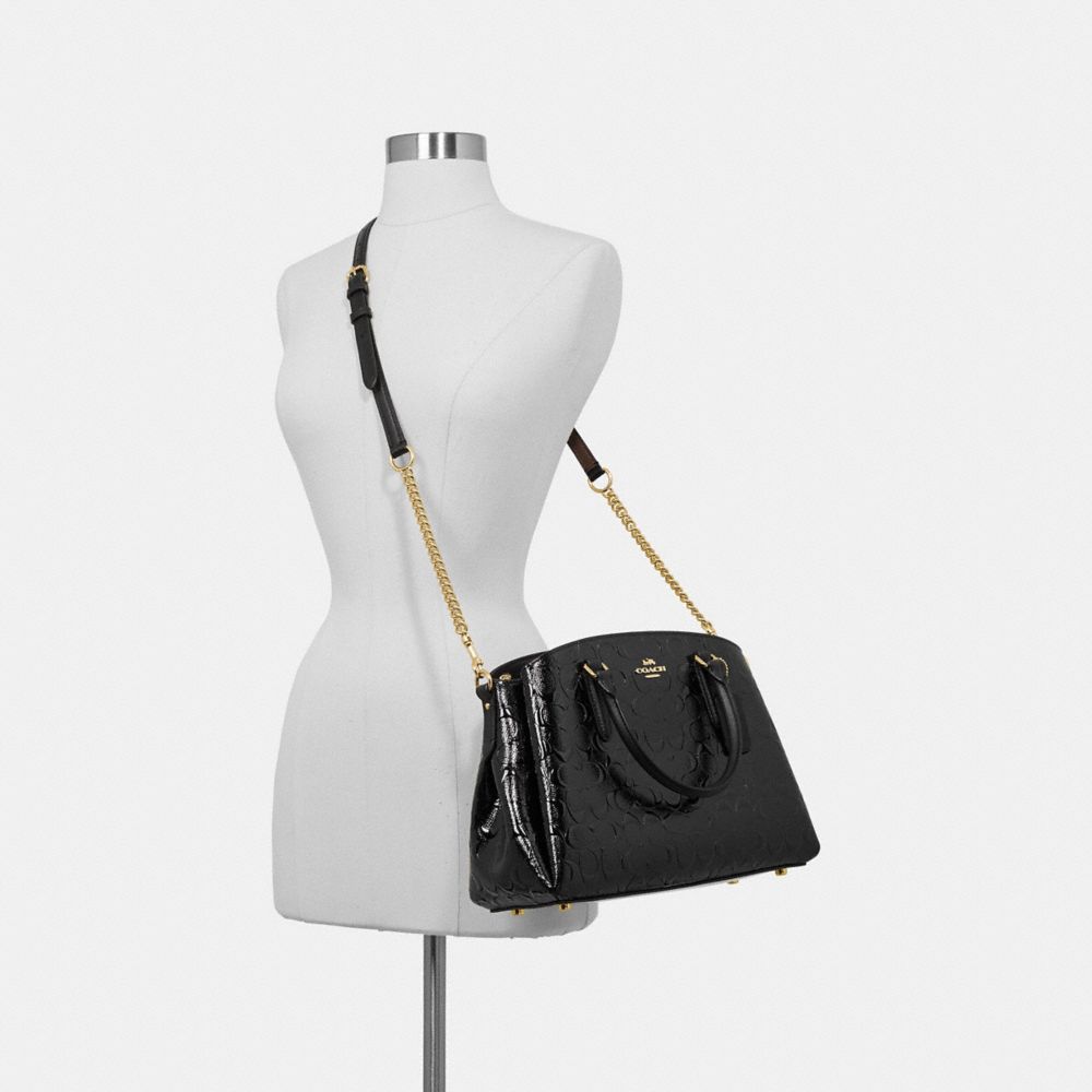 | Signature patent leather| Inside multifunction pocket| Center zip compartment| Snap closure, fabric lining| Handles with 4" drop| Detachable strap with 20" drop for shoulder or crossbody wear| 12 1/2" (L) x 8 1/2" (H) x 5" (W)