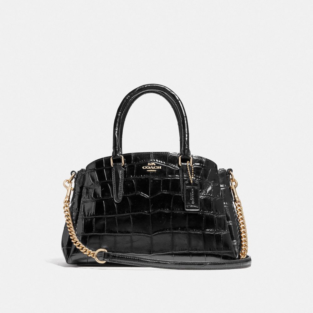 | Crocodile-embossed leather and smooth leather| Center zip compartment| Snap closure, fabric lining| Handles with 4" drop| Detachable strap with 20" drop for shoulder or crossbody wear| 9 3/4" (L) x 6 3/4" (H) x 4 1/4" (W)