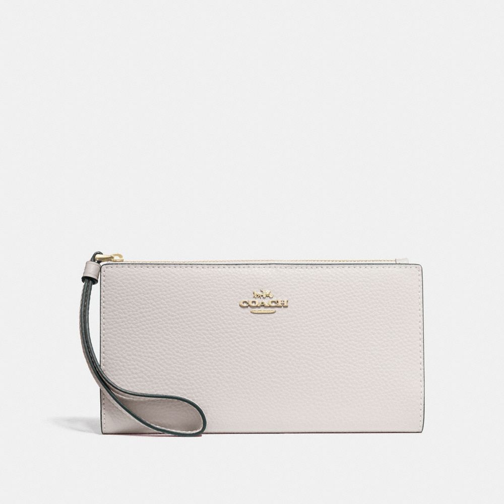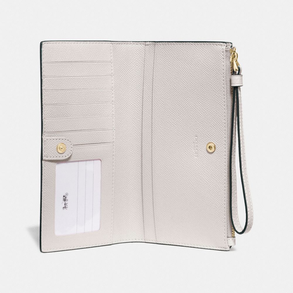 Polished pebble leather| Six credit card slots| ID window| Full-length bill compartments| Zip coin pocket| Snap closure| Wrist strap attached| 7 1/2" (L) x 4" (H) x 3/4" (W)