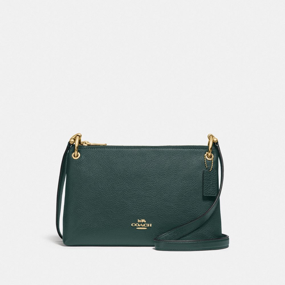Refined pebble leather| Two credit card slots| Inside multifunction pocket| Center snap compartment| Double zip closure, fabric lining| Adjustable strap with 22 3/4" drop for shoulder or crossbody wear| 9 3/4" (L) x 6 3/4" (H) x 2 3/4" (W)