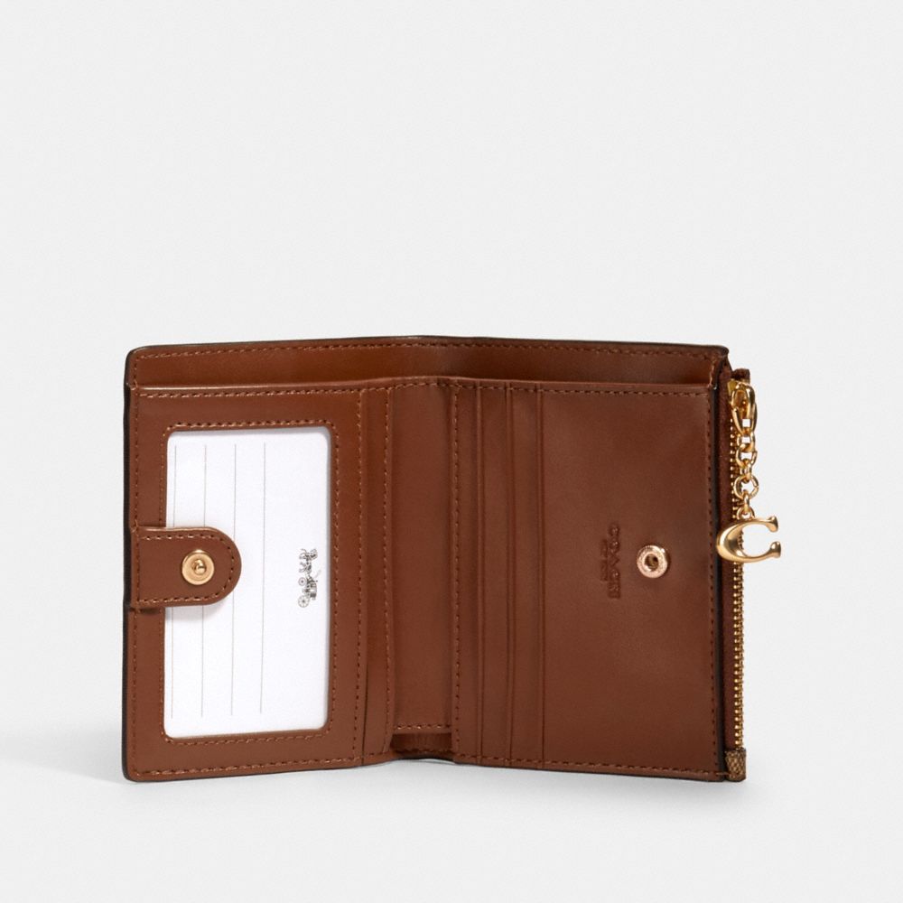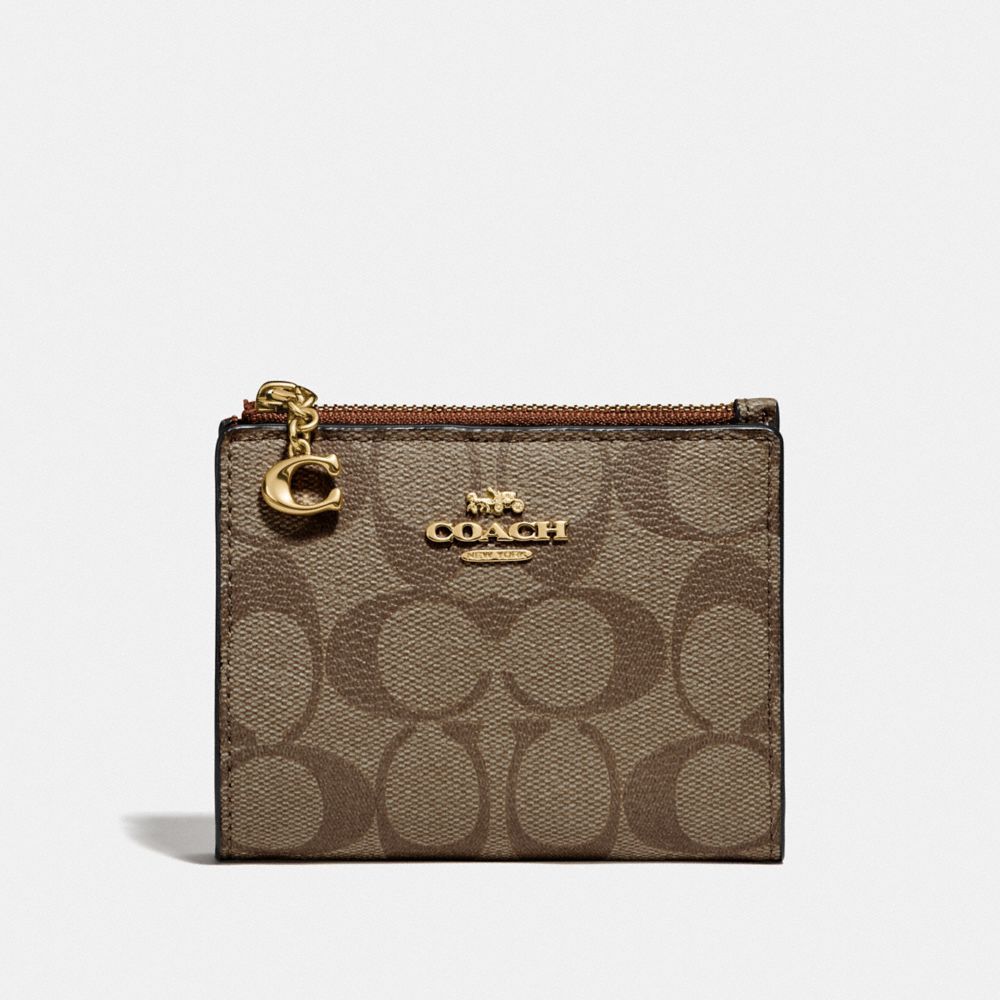 Signature coated canvas| Three credit card slots| Full-length bill compartment| ID window| Snap closure| Zip coin pocket| 4 1/2" (L) x 3 3/4" (H)