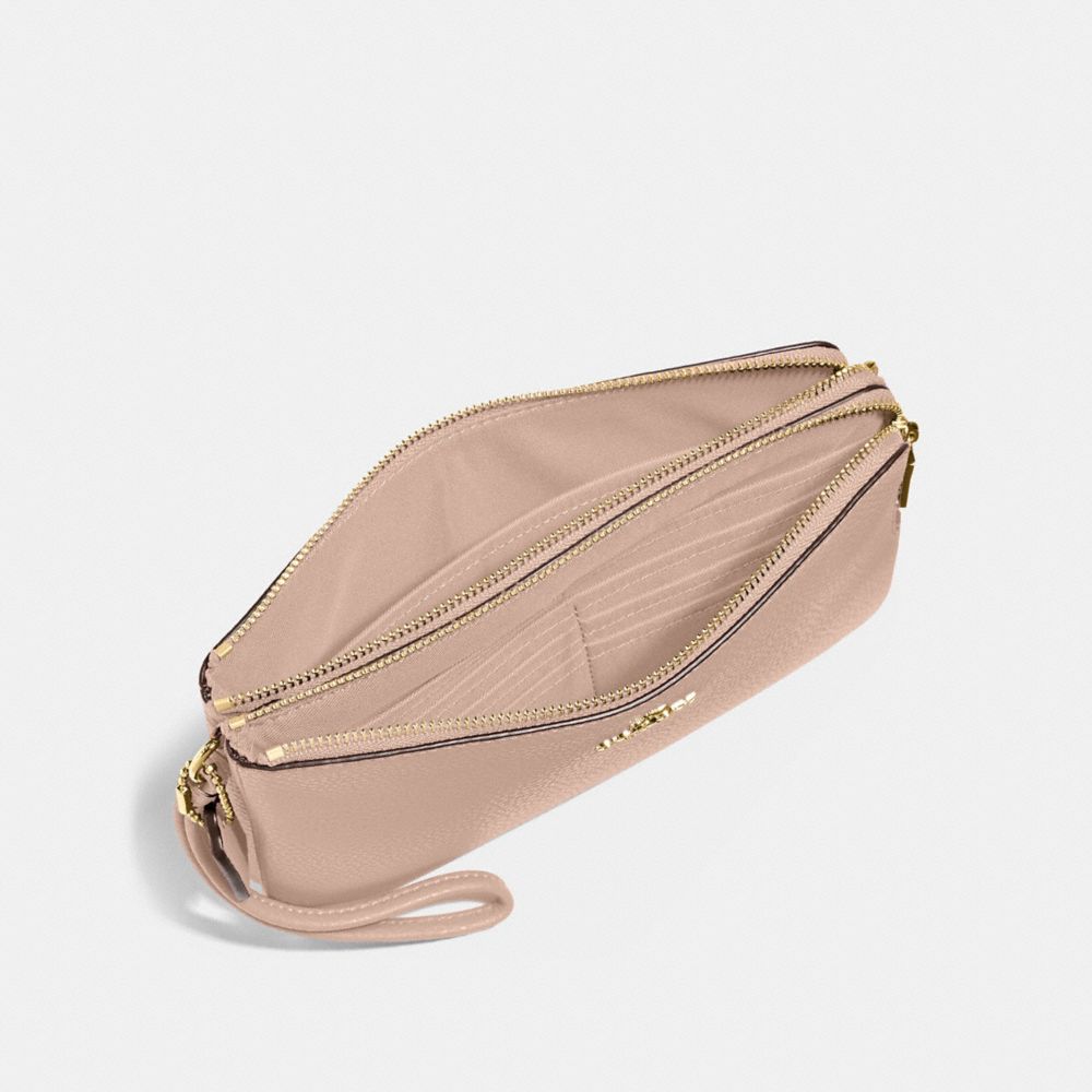 Polished pebble leather| Six credit card slots| Full-length bill compartment| Inside open pockets| Double zip closure, fabric lining| Wrist strap attached| 8" (L) x 4 3/4" (H) x 1 1/4"| Fits all phone sizes up to an iPhone X and Samsung S7 Edge
